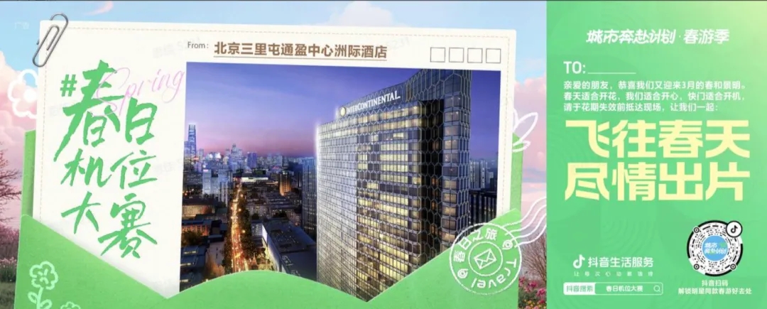 三里屯洲際還將營(yíng)銷(xiāo)戰(zhàn)場(chǎng)延伸至三萬(wàn)英尺高空,與航空公司達(dá)成「萬(wàn)米高空品效陣地」合作,為本次抖音生活服務(wù)「城市奔赴計(jì)劃·春游季」-「春日機(jī)位大賽」的活動(dòng)特別定制了3萬(wàn)張印有酒店外景的限量登機(jī)牌,聯(lián)合航空?qǐng)鼍熬珳?zhǔn)營(yíng)銷(xiāo),直接觸達(dá)商務(wù)精英人群。登機(jī)牌背面嵌入二維碼,用戶(hù)掃碼即可直達(dá)優(yōu)惠預(yù)訂頁(yè)面,在萬(wàn)米高空“種草”春日奢旅體驗(yàn)。讓原本封閉的飛行時(shí)間直接變?yōu)?ldquo;決策窗口期”,將“高空流量”轉(zhuǎn)化為“消費(fèi)增量”。
