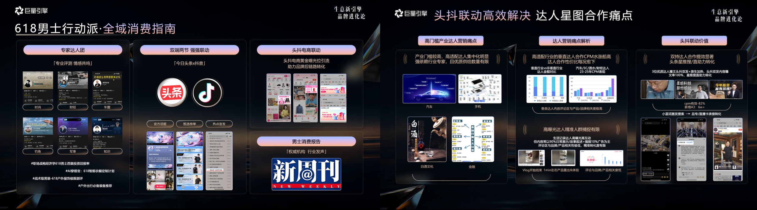 頭抖雙端全域聯(lián)動,借勢父親節(jié)車展節(jié)點助力品牌高效種草與精準轉化專業(yè)內(nèi)容構建信任,數(shù)據(jù)驅(qū)動優(yōu)化效果,今日頭條平臺數(shù)據(jù)顯示,具備專業(yè)身份屬性的達人(如醫(yī)生、工程師、行業(yè)專家)內(nèi)容互動率和轉化率顯著高于泛娛樂內(nèi)容。 為迎接父親節(jié)、8月汽車車展等重要營銷節(jié)點,今日頭條特別推出了系列達人圖鑒,如「攻略老爸幫幫團」達人圖鑒以及「頭號汽車大玩家」達人圖鑒,旨在通過精準匹配適合不同節(jié)日氛圍與目標受眾的專業(yè)達人,增強品牌的市場影響力。除此之外,今日頭條聯(lián)合抖音推出《頭抖達人流量加油計劃》,以“高專業(yè)度+高性價比+高轉化力”三力合一,助力品牌傳播效率翻倍,顯著提升投資回報率。 除此之外,今日頭條聯(lián)合抖音推出《頭抖達人流量加油計劃》,以“高專業(yè)度+高性價比+高轉化力”三力合一,助力品牌傳播效率翻倍。 一、高專業(yè)度:官方精篩1500+頭條/抖音雙持達人,覆蓋38個垂類,均為行業(yè)高投放達人。 二、高性價比:品牌僅需支付星圖單平臺價格,即可實現(xiàn)雙端流量聯(lián)動,CPM降低或增溢流量30%。 三、高轉化力:通過頭條小藍詞功能,品牌內(nèi)容直接跳轉核心會場,縮短決策鏈路,提升轉化效率。 品牌商家不僅能夠通過《頭抖達人流量加油計劃》的專屬資源包,享受達人合作的定制化優(yōu)惠,還能借助《618營銷招商手冊》,深入了解平臺流量扶持政策及達人合作案例。
