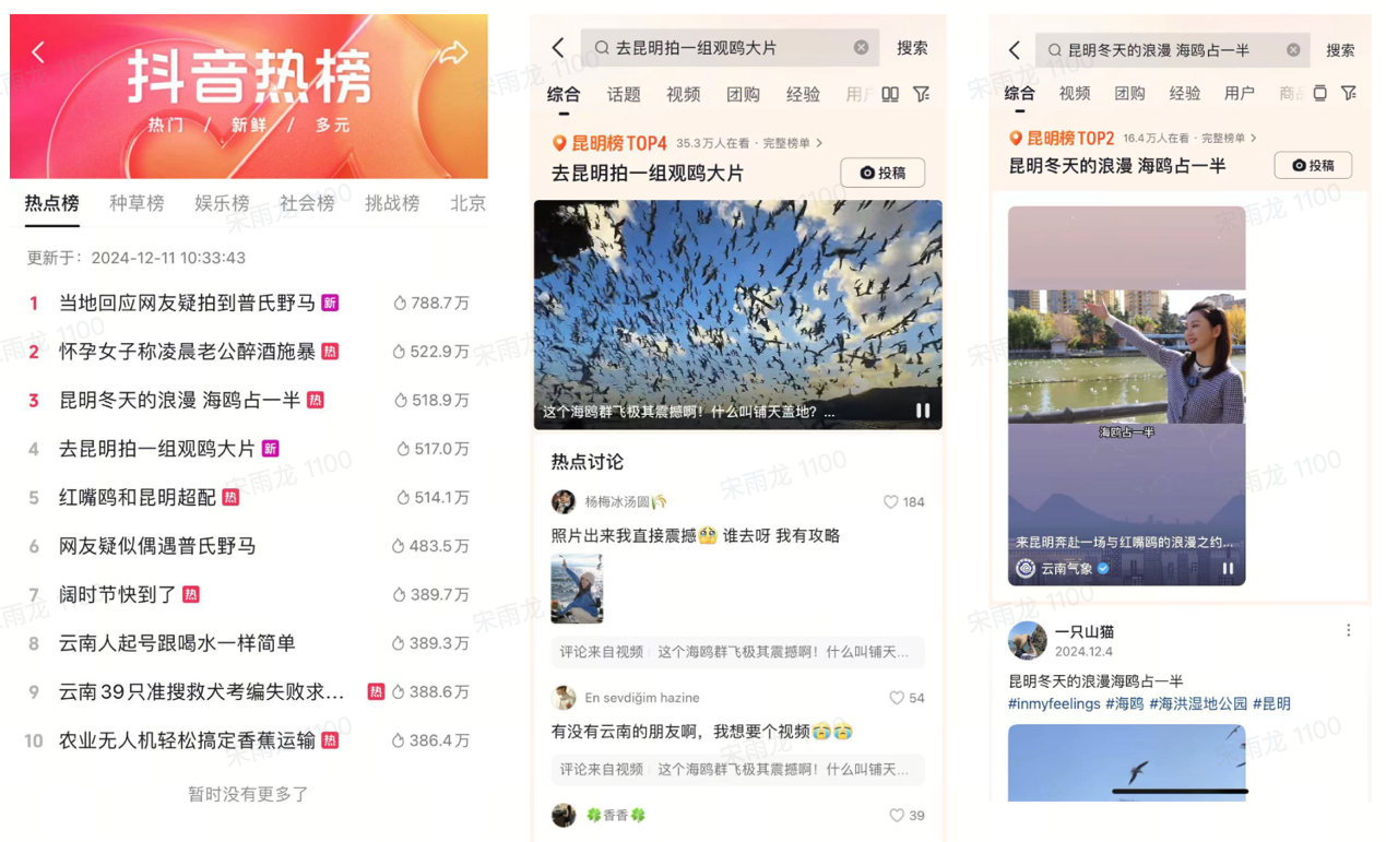 海埂大壩里,煙波浩渺的湖水、巍峨壯觀的西山、身姿健美的紅嘴鷗、天高云淡的藍天,這樣浪漫的美景都讓人流連忘返,誰又能忍住不美拍分享一番呢?抖音生活服務還將聯(lián)動商家開展短視頻激勵大賽,本地商家?guī)?來南方過冬 、#冬日暖暖游云南 等話題及POI發(fā)布內容,就有機會獲得平臺流量激勵,發(fā)布觀鷗熱點則可進行獲得流量獎勵,通過內容輻射,更多用戶感受到了濃厚的觀鷗氛圍,促進活動影響力不斷提升。
