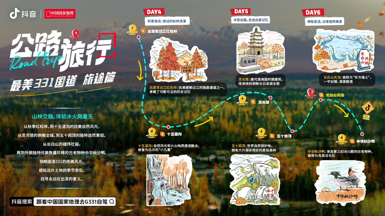 關(guān)于本次旅途上的更多精彩內(nèi)容,可以在抖音搜索“跟著中國國家地理去G331自駕”,身臨其境感受這場秋日公路旅行。