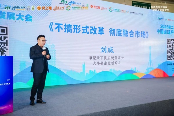 華聚天下供應(yīng)鏈董事長、大牛醬鹵堂創(chuàng)始人劉威帶來主題分享《不搞形式改革 徹底融合市場》,提出"鹵味企業(yè)應(yīng)從供應(yīng)鏈、品牌運(yùn)營、消費(fèi)場景三方面進(jìn)行深度融合"的創(chuàng)新理念。