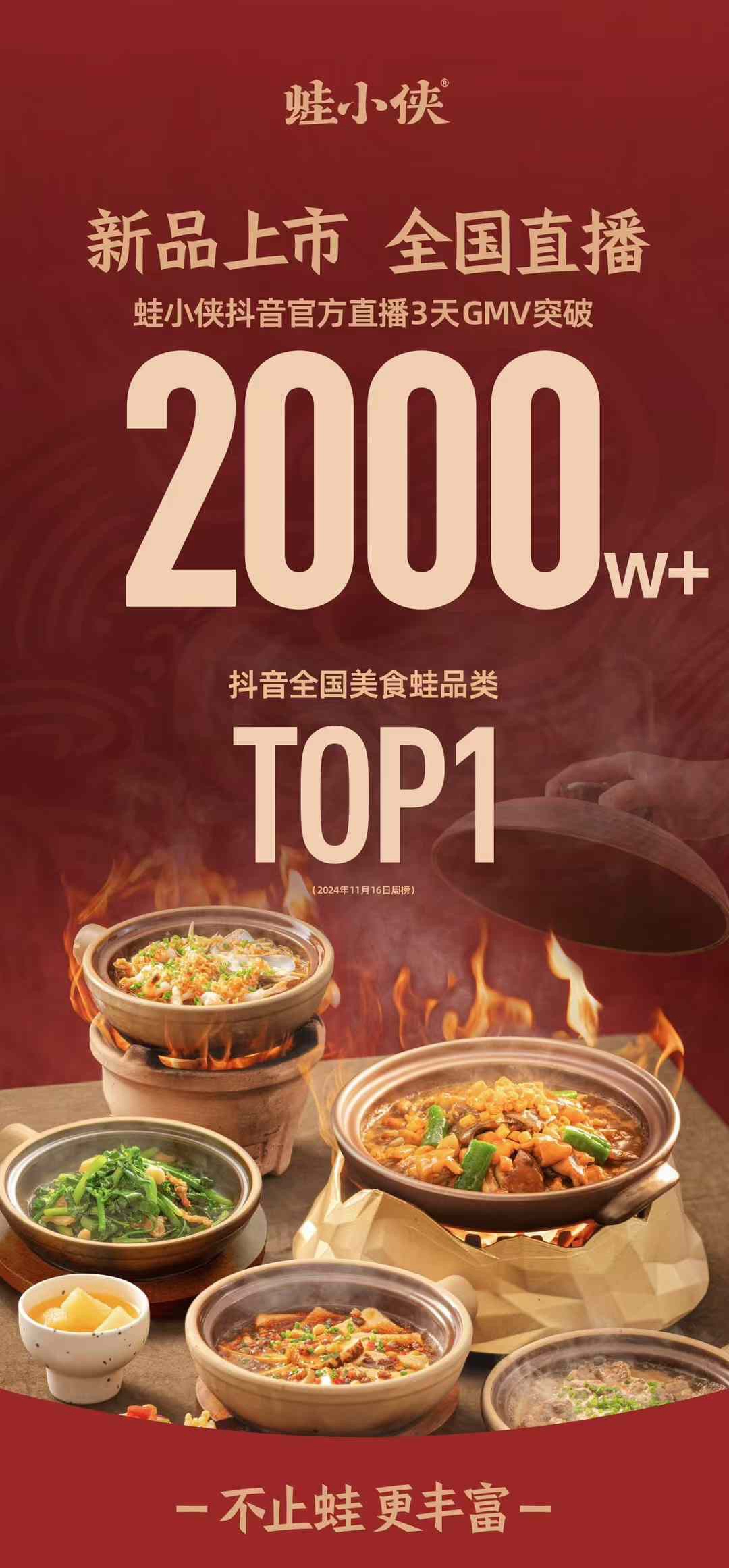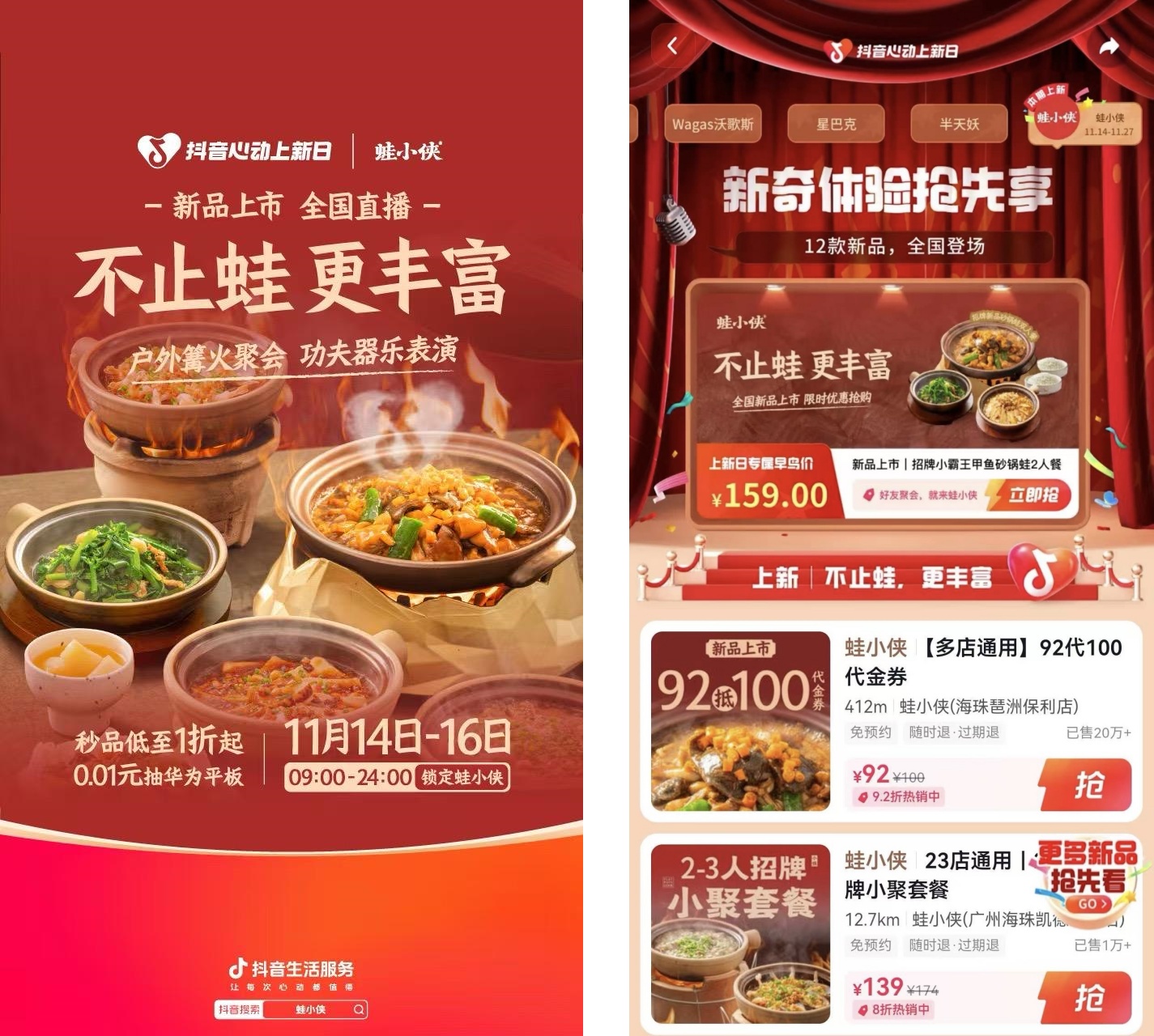 為熱烈慶祝新品的全面上市,蛙小俠攜手「抖音心動(dòng)上新日」特列推出了「不止蛙,更豐富」主題活動(dòng),不僅為大家奉上了沸騰砂鍋系列的心動(dòng)上新品,還通過(guò)主理人空降直播間、東方文化演繹、戶外山谷直播等系列互動(dòng)玩法,誠(chéng)邀廣大吃蛙星人共赴蛙小俠,實(shí)現(xiàn)蛙肉自由,以一鍋熱氣騰騰的蛙鍋治愈整個(gè)冬日。