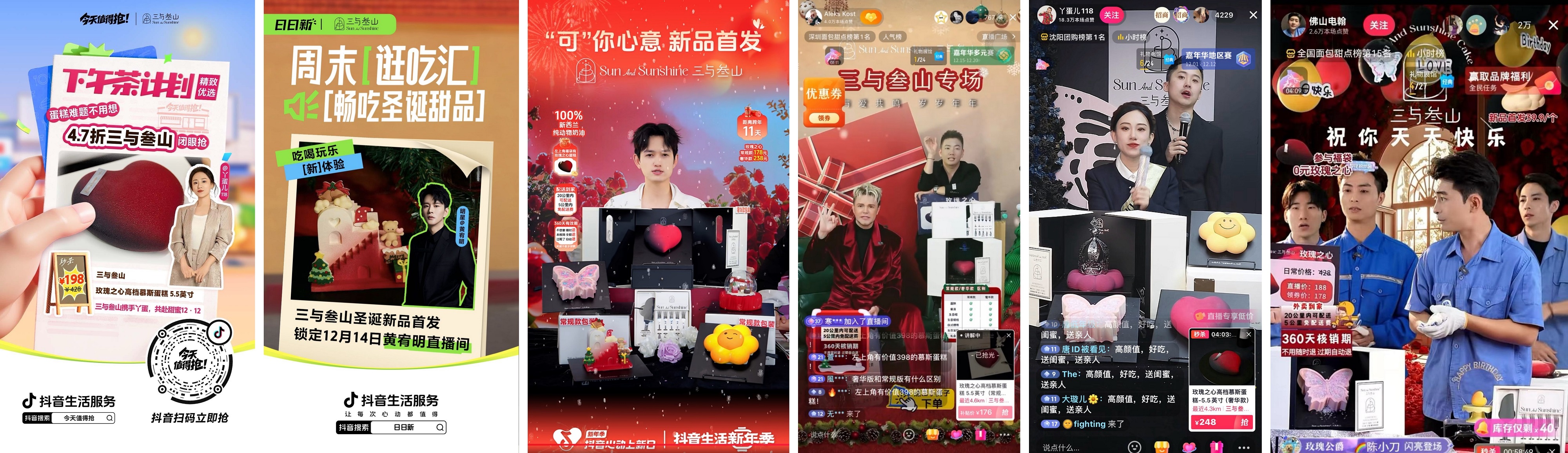 三與叁山精準(zhǔn)捕捉年尾用戶的消費需求,攜手「抖音心動上新日」于12月8日至12月31日共同打造了一場年度重磅福利活動,主推的“心愿星球:跨年許愿概念蛋糕”以其“每個愿望都值得被聽見”的獨特賣點,賦予消費者濃厚的氛圍感和儀式感。三與叁山還在圣誕研制出了氛圍感節(jié)日單品“圣誕愛之屋”,此款蛋糕不僅在產(chǎn)品原料和口感上進(jìn)行了全面升級,并且附贈圣誕插件,供顧客DIY專屬圣誕小屋,拉滿社交屬性。為進(jìn)一步加大上新力度,三與叁山還邀請明星丫蛋在直播間放福利,依托差異化玩法和高性價比組品, 促使品牌實現(xiàn)交易破峰。在圣誕節(jié)點,品牌攜手黃宥明、馬可邀請廣大用戶共同參與圣誕甜品的暢吃盛宴。值得一提的是,在2024年巨量引擎城市生態(tài)大會的收官站中,人民創(chuàng)意與三與叁山聯(lián)袂推出的頤和園聯(lián)名款“四合頤韻”慕斯蛋糕,憑借其獨到的文化創(chuàng)意和卓越的營銷成效,榮獲了「文旅」案例營銷大獎,三與叁山在此基礎(chǔ)上的上新聯(lián)動,不斷擴(kuò)大著品牌影響力,為整個烘焙行業(yè)樹立了值得效仿的經(jīng)營范例,有效帶動了線下門店的實際收益增長。