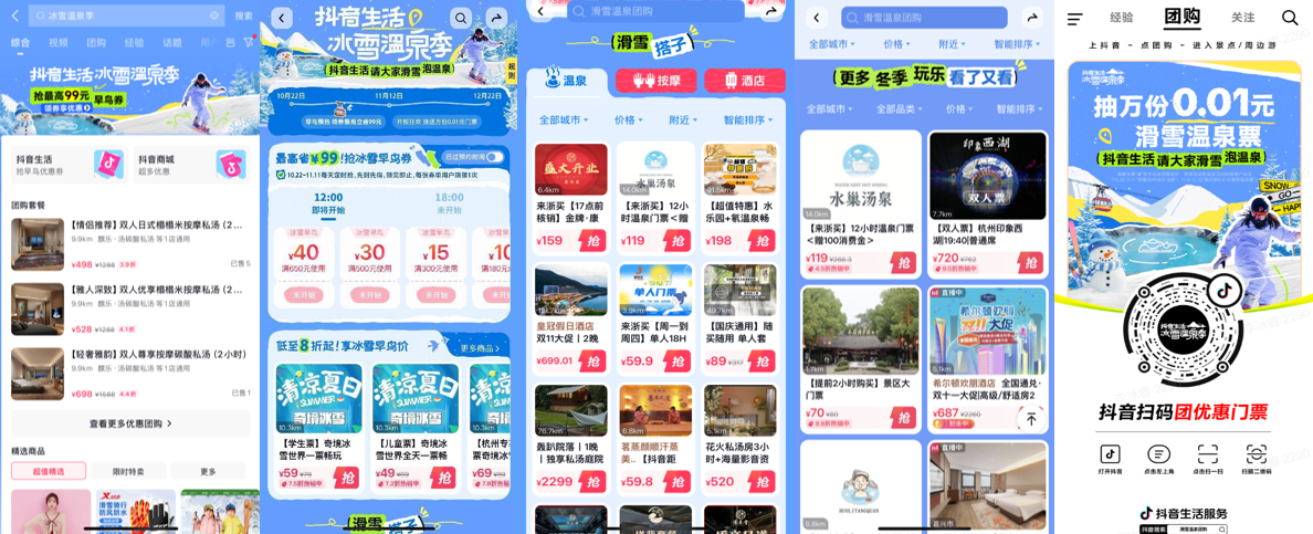 抖音生活溫泉季活動囊括全國各地的雪場溫泉、休閑按摩、酒店,進入活動頁面無論是初次嘗試滑雪的新手,還是追求極限挑戰(zhàn)的專業(yè)玩家,亦或是只想在溫泉水中放松身心的休閑愛好者,這里都有適合你的過冬新體驗。 最后一波“羊毛”!必須薅住啊朋友們!