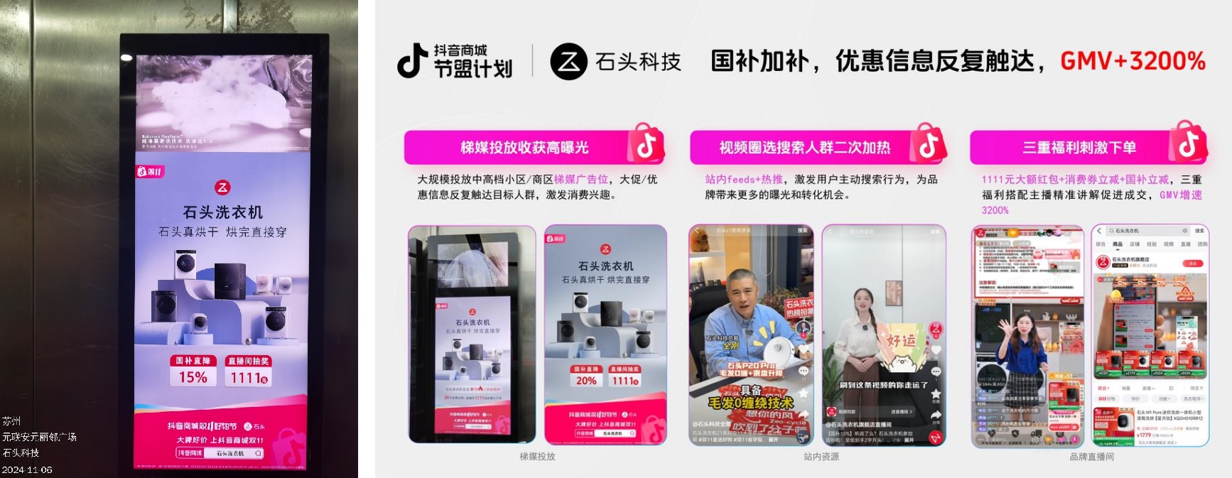 包括家電品牌石頭,也是通過線下梯廣+線上抖音商城大牌鉅惠IP一系列環(huán)環(huán)相扣的鏈路,完成從品宣流量到轉(zhuǎn)化承接的提效。特別是對(duì)高檔小區(qū)/商區(qū)等梯媒廣告的精準(zhǔn)投放,讓品牌大促/優(yōu)惠信息反復(fù)精準(zhǔn)觸達(dá),最終集中爆發(fā)的成績顯眼。