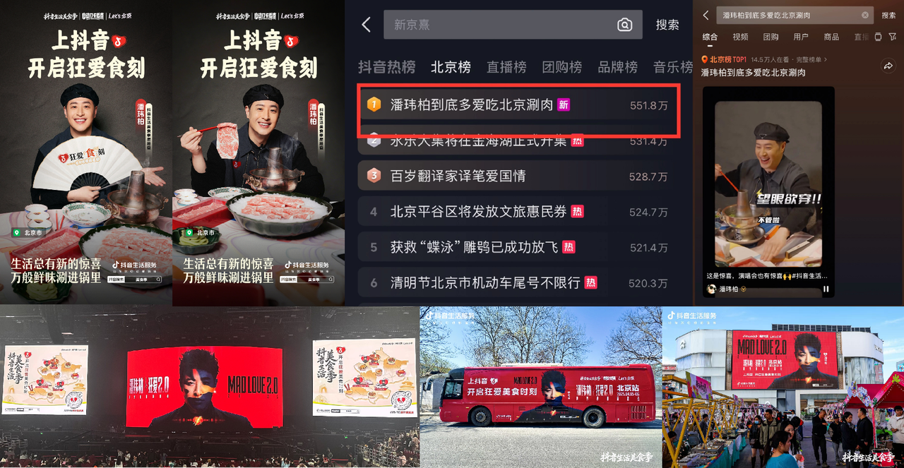 活動深度聯(lián)動明星演唱會及政務活動,以文旅資源為核心驅(qū)動流量。 美食季特邀@潘瑋柏 擔任“抖音生活美食季星推官”,與其「狂愛2.0」巡回演唱會北京站深度聯(lián)動。潘瑋柏發(fā)布的北京銅鍋涮肉探店 Vlog 一經(jīng)上線,便迅速登上北京同城熱榜 TOP1。視頻中,潘瑋柏不僅體驗了北京特色游船“狂愛美食號”,還驚喜現(xiàn)身北京銅鍋涮肉店,在沉浸式品味鮮嫩羊肉的同時,與粉絲分享獨特的美食見解與感受,為觀眾呈現(xiàn)了一場別具特色的美食之旅?!究駩勖朗车貓D】亮相演唱會現(xiàn)場,為觀眾提供當?shù)孛朗持改稀Mㄟ^線上線下結合點亮全城氛圍,線下覆蓋北京 7 大核心商圈,曝光量近千萬。