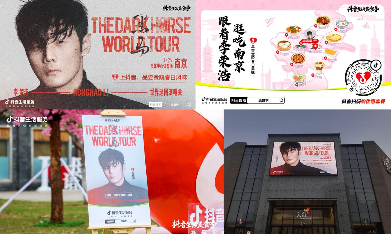 李榮浩「黑馬」南京演唱會期間,美食季以 “跟著李榮浩逛吃南京,品嘗金陵春日風味” 為紐帶,借勢明星熱度實現(xiàn)文娛與美食的跨界聯(lián)動。演唱會聯(lián)名海報在南京各大高客流商圈密集投放,海報巧妙融合演唱會元素與美食季標識,迅速吸引大批粉絲駐足掃碼。觀眾通過海報二維碼直達抖音活動頁,獲取美食打卡攻略與優(yōu)惠信息。觀眾在觀賞演唱會后,紛紛前往推薦的美食店鋪打卡,沉浸式體驗金陵春日美食,成功將明星流量精準轉化為線下消費熱潮,實現(xiàn)線上線下的高效聯(lián)動與商業(yè)價值提升。