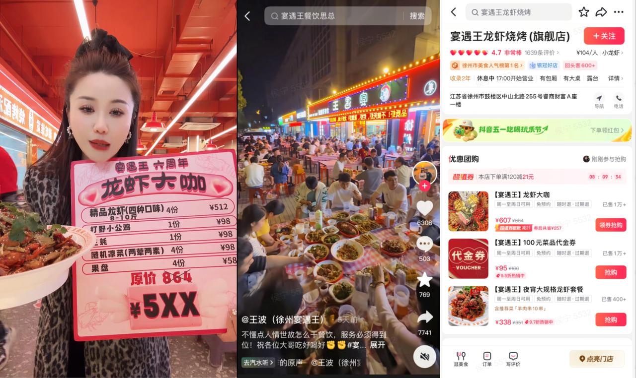 宴遇王龍蝦:老板自播激活增量 江蘇宴遇王龍蝦抓住美食季和龍蝦熱度重啟營業(yè),借助抖音活動實現(xiàn)純增量支付608萬。老板作為30萬+粉絲達人,親自上陣品牌六周年自播,場均產(chǎn)出超50萬。主推的“龍蝦大咖套餐”(579元)售出2000+單,單品GMV突破100萬,成功激活老粉消費熱情。
