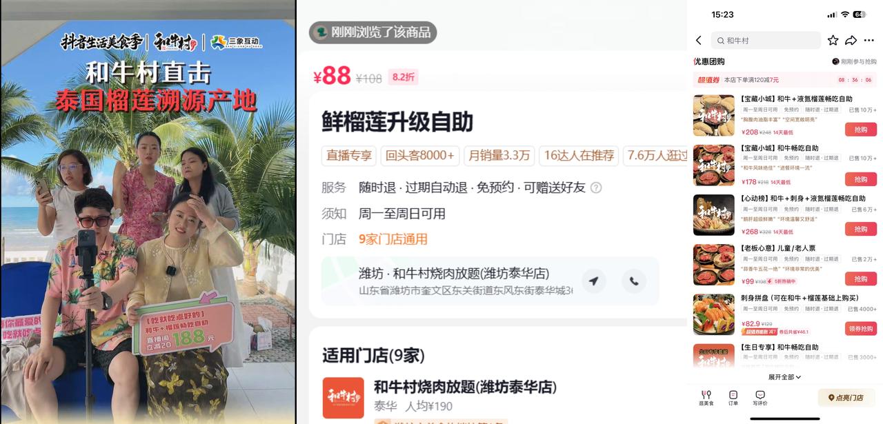 和牛村:原產(chǎn)地直播引爆流量 山東和牛村以原產(chǎn)地直播為亮點,將直播間搬至泰國榴蓮供應地,單場直播GMV突破1500萬。通過門店全天連線直播,實現(xiàn)多地流量匯聚,主推的“和牛+液氮榴蓮暢吃自助套餐”(198元)售出2.7萬單,單品GMV達241.6萬?;顒忧?,煙臺三大萬達廣場連續(xù)7天投放和牛村美食季海報,引導用戶關注。同期,700萬+粉絲本地達人探店,熱度持續(xù)升溫。大場直播后,商家調(diào)整貨盤價格差,通過門店持續(xù)直播鎖定優(yōu)惠流量,最終支付GMV達2573萬,環(huán)比增長928萬。