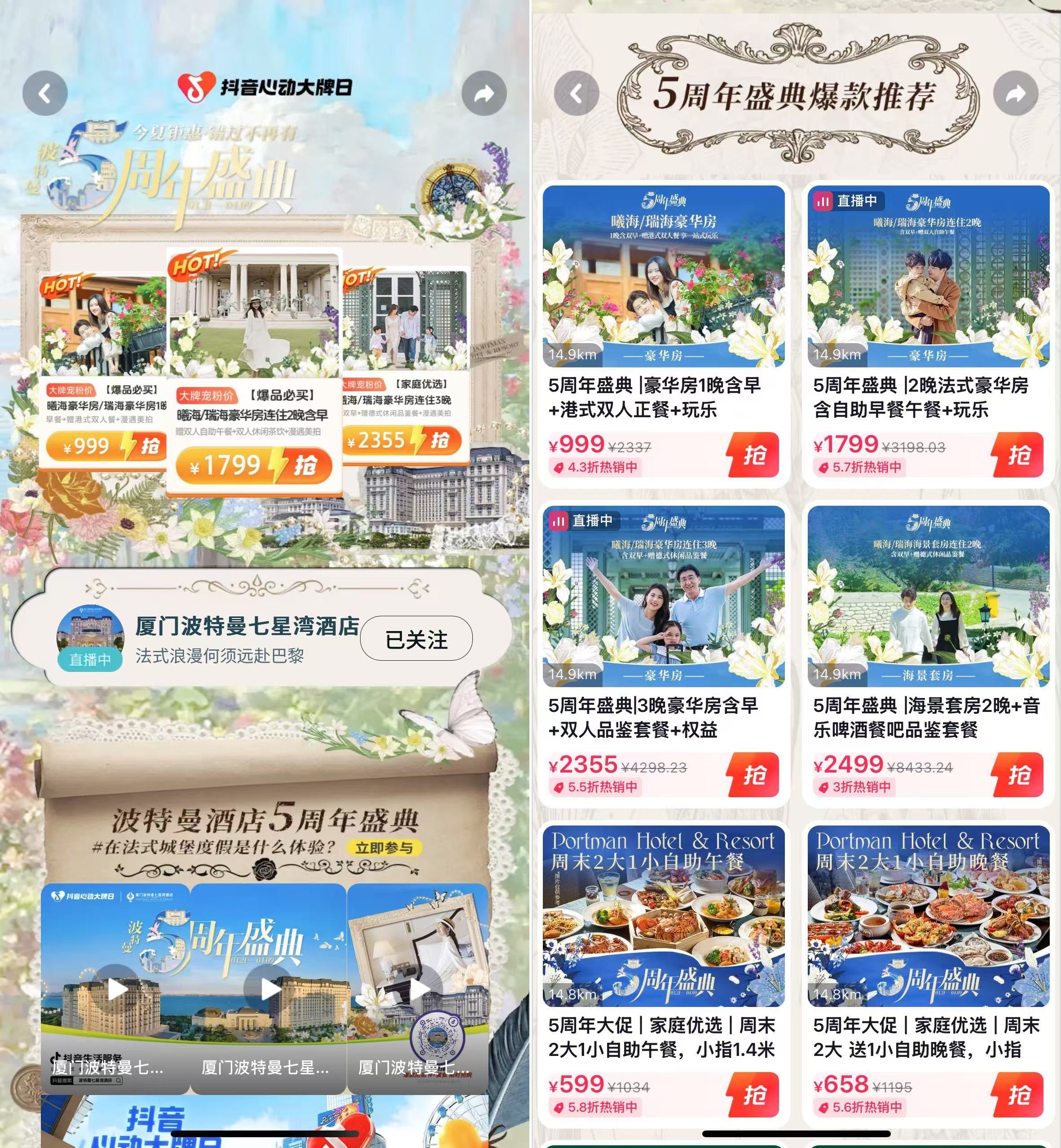 如何不斷拉高粉絲朋友們對5周年盛典的期待感與心動值? 波特曼酒店品牌官方探索出了系列熱門玩法,不斷打響全網聲量。線上端提前打造了#在法式城堡度假是什么體驗、#是廈門不是歐洲、#廈門波特曼酒店5周年盛典等多條熱點話題造勢預熱,成功引爆消費者社交討論與自發(fā)式傳播;同時配合多系列短視頻內容宣傳先行,開屏資源推出“法式心動品牌專區(qū)”等多重玩法,提高用戶看后搜,不斷拓寬活動信息的傳播渠道,讓更多人看到、了解并參與到這場盛大慶典中。 值得一提的是, 波特曼酒店聯動「抖音心動大牌日」搭建了多場“好看吸睛”直播間,深度聚焦“花草、法式和浪漫”三大視覺元素以營造超絕氛圍感,深化了用戶對異地度假旅游目的地的感知度。本次官方直播間更是突破GMV1074萬,多次登頂酒店直播全國榜一、創(chuàng)福建酒旅單場直播支付新高。 本次品牌新增餐飲直播間,通過探索餐飲直播新玩法,拉高整體GMV及后續(xù)核銷值。直播間不再拘泥美食場景,而是將“法式氛圍感”植入直播,將直播間搬到環(huán)東浪漫線,依海而播,將用戶眼光鎖定在直播間的海景浪漫中。 福利機制也是相當“給力”:每場直播均為大家贈送了高端餐飲套餐等豐厚加碼福袋驚喜隨機掉落,有效提升了用戶在直播間的停留時間和人氣。 為了持續(xù)點燃官方直播間熱度,波特曼酒店還巧妙聯動站內高人氣達人同步開播,通過增加頭部達人參與數量,既彰顯了品牌影響力,又借助明星達人的粉絲效應,提高了品牌曝光和粉絲關注度。 落實到線下層面,波特曼酒店結合大牌日心動玩法,在酒店大堂、餐廳、客房等區(qū)域設置展架和互動打卡裝置,吸引賓客眼球,同時在周邊商圈等人流密集區(qū)大屏滾動“種草”用戶,多維度帶動大促破圈傳播的同時, 全方位滲透了“來廈門,就住波特曼”的心智概念。