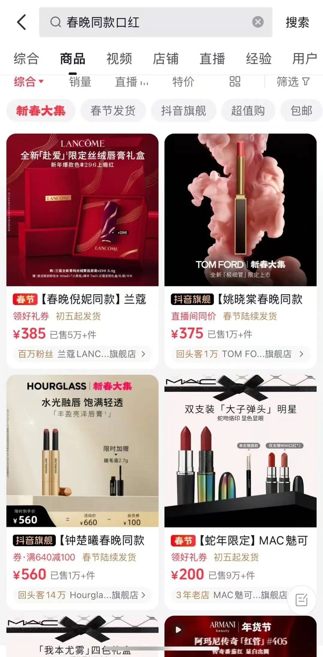 例如,明星同款妝容成為了熱門品類。伴隨著春晚節(jié)目的播出,觀眾在抖音電商搜索框中輸入“晚會同款+明星+品類”,即可完成商品搜索及下單。如倪妮在春晚無錫場中演唱江南小調《無錫景》時所涂的蘭蔻口紅,瞬間成為了“好色”人的心頭好。同樣出圈的還有鐘楚曦Hourglass同款口紅,售出800單,GMV超30萬,環(huán)比增幅高達1129%。