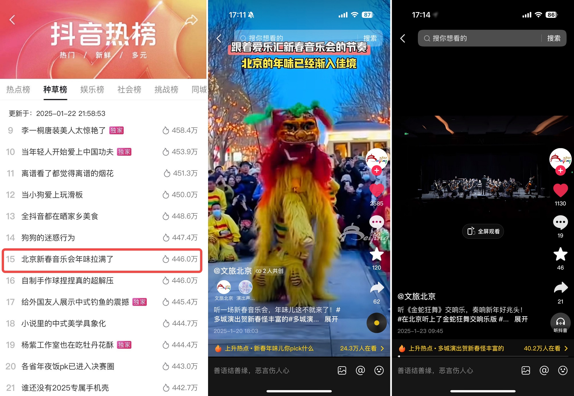 抖音演出聯(lián)動(dòng)@文旅北京,共創(chuàng)2條新春音樂會(huì)宣發(fā)視頻,巧妙植入城市地標(biāo)與演出亮點(diǎn),視頻播放量15萬+,助力#北京新春音樂會(huì)年味拉滿了 活動(dòng)話題登上種草榜TOP15,為宣發(fā)加碼。