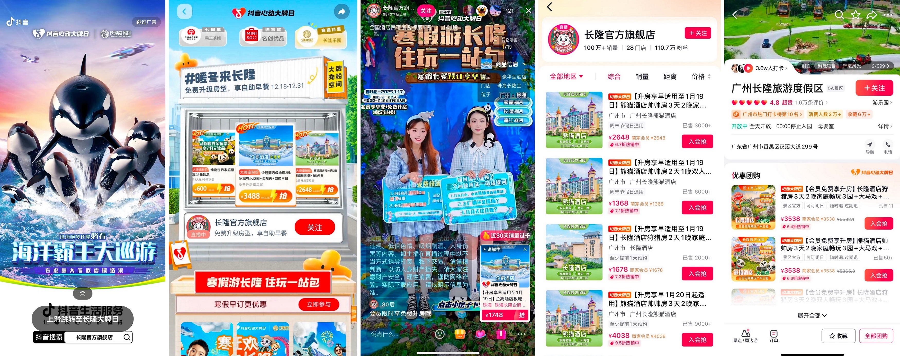 大型游樂勝地長隆度假區(qū)攜手「抖音心動大牌日」,精心打造了一場“暖冬來長隆”主題活動,為公眾提供寒假及春節(jié)出游新玩法。自12月18日至12月31日,長隆度假區(qū)的官方賬號直播間開啟大放“價”模式,不僅有企鵝酒店、橫琴灣酒店、飛船酒店、馬戲酒店等眾多獨具特色的主題酒店任意挑選,而且品牌還針對出游人數(shù)、游玩天數(shù)等具體細節(jié)需求,提供了多樣化的套餐選擇,長隆的經(jīng)典演出和自助早餐也均包含在內(nèi),會員更可享受限時免費升房的專屬特權(quán);套餐還擁有超長的兌換有效期,確保游客在沉浸于歡樂之旅時,既省心又開心。長隆度假區(qū)的此次暖冬預(yù)售活動,采用了線上線下聯(lián)動、短視頻預(yù)熱曝光與大場直播沖刺相結(jié)合的長效策略機制,成功在年底實現(xiàn)了交易沖刺,為品牌2025年的持續(xù)經(jīng)營夯實基礎(chǔ)。