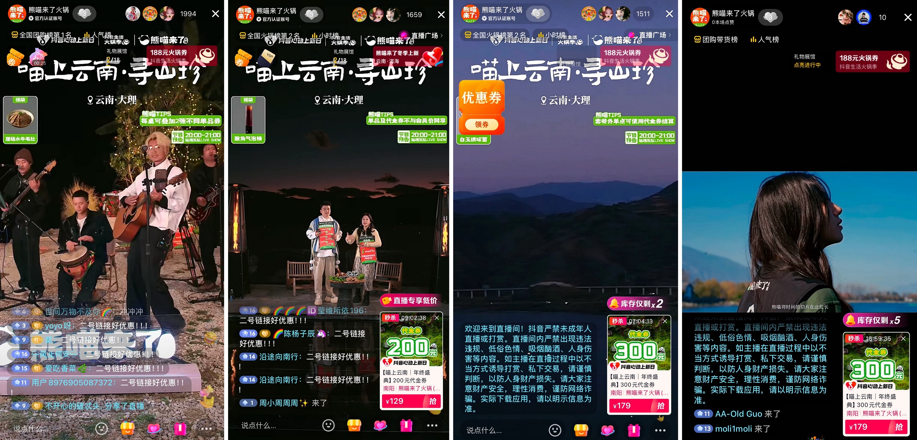 熊喵來了火鍋在2024年收官之際,攜手「抖音心動上新日」繼續(xù)在全國各地搜尋好食材,將彩云之南作為其收官溯源的最后一站,于12月14日至12月23日期間,繼【喵上新疆】、【喵上北?!俊ⅰ具魃隙朊肌康赜蛩菰聪盗兄?,啟動“【喵上云南·尋山珍】”主題活動,與廣大食客一同為生活的煙火氣添彩助興。抖音官方直播間內(nèi),除了多面額代金券、“boss價到”寵粉福利套餐等優(yōu)惠外,熊喵來了火鍋還推出了白玉繡球菌、嘗鮮雙人餐、酸角氣泡桶、屠場水牛毛肚等福袋限時秒殺福利,不斷提升直播間看點和關(guān)注度,套餐還可額外疊加使用兩張單品券,讓用戶就餐時盡享升級版福利;值得一提的是,官方大場直播選址于有山有水的戶外場景,讓觀眾在沉浸式的視覺沖擊中感受品牌魅力,搭配樂隊演唱等精彩環(huán)節(jié),深度滲透熊喵來了火鍋“將用戶體驗前置”的品牌理念,最終促成了官號“開播一小時破百萬、開播半小時全國火鍋日榜第一”的目標達成,有力帶動了線上曝光轉(zhuǎn)化、線下交易飆升的閉環(huán)式增長。