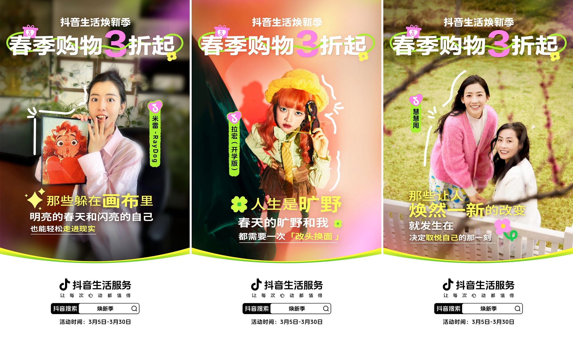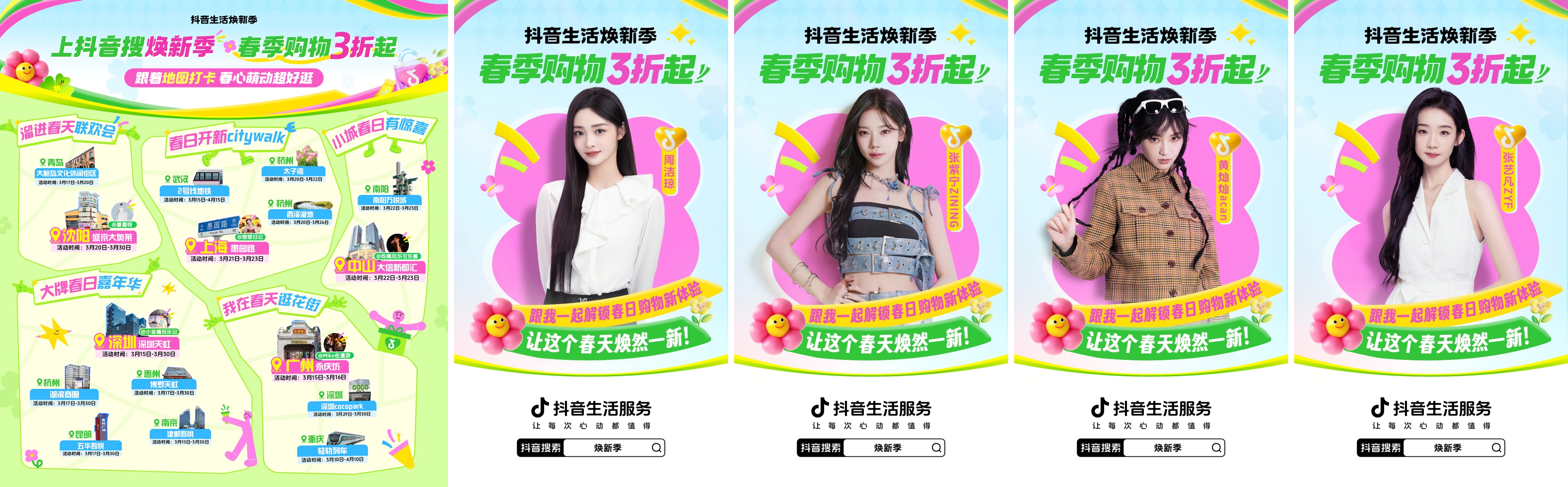 整個(gè)三月,「抖音生活煥新季」持續(xù)帶動(dòng)不同城市、不同圈層的用戶(hù)參與到這場(chǎng)“春日嘉年華”:每周發(fā)布全國(guó)春日城市地圖,和用戶(hù)相聚青島、沈陽(yáng)、上海、廣州等近十座城市打卡、賞花、購(gòu)物,來(lái)一場(chǎng)開(kāi)新“citywalk”;攜手周潔瓊、張紫寧、黃燦燦、張藝凡等多位明星,發(fā)起煥新號(hào)召,官號(hào)簽名照福利帶動(dòng)粉絲參與。