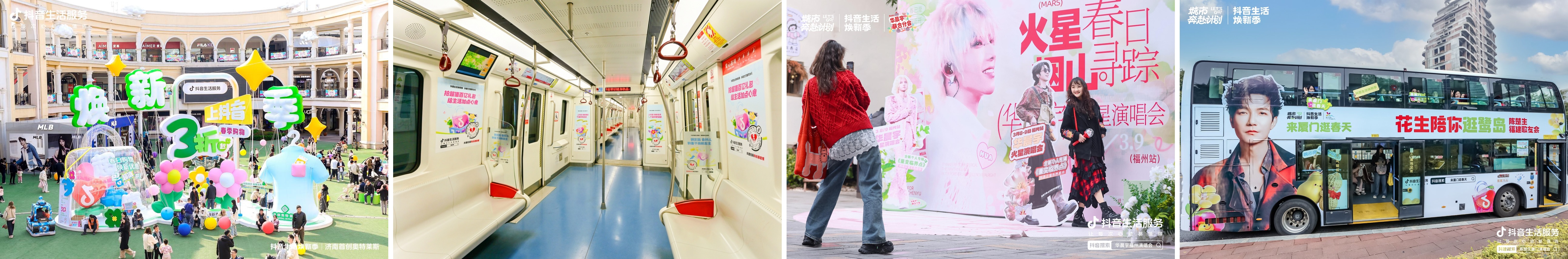 在濟(jì)南,聯(lián)動(dòng)首創(chuàng)奧萊落地創(chuàng)意裝置,邀約12位同城達(dá)人打卡,分享#濟(jì)南的春天抬頭即是浪漫,登上濟(jì)南同城榜Top2,4天吸引10萬(wàn)+人流量。在沈陽(yáng),抖音生活嘉年華始發(fā)一列開(kāi)往春天的地鐵,帶著眾多商家、品牌走出商圈,與步履匆匆的市民在通勤路上打個(gè)照面。在杭州,合作花朝節(jié),與太子灣郁金香花展攜手布置煥新打卡點(diǎn),把煥新融入賞花踏青的生活方式之中。在深圳,聯(lián)合CoCoPark打造春日煥新小鎮(zhèn),落地互動(dòng)市集,邀約達(dá)人打卡,為線(xiàn)下商圈聚集客流。多地大屏也集體煥新,讓「抖音生活煥新季」亮相城市C位。