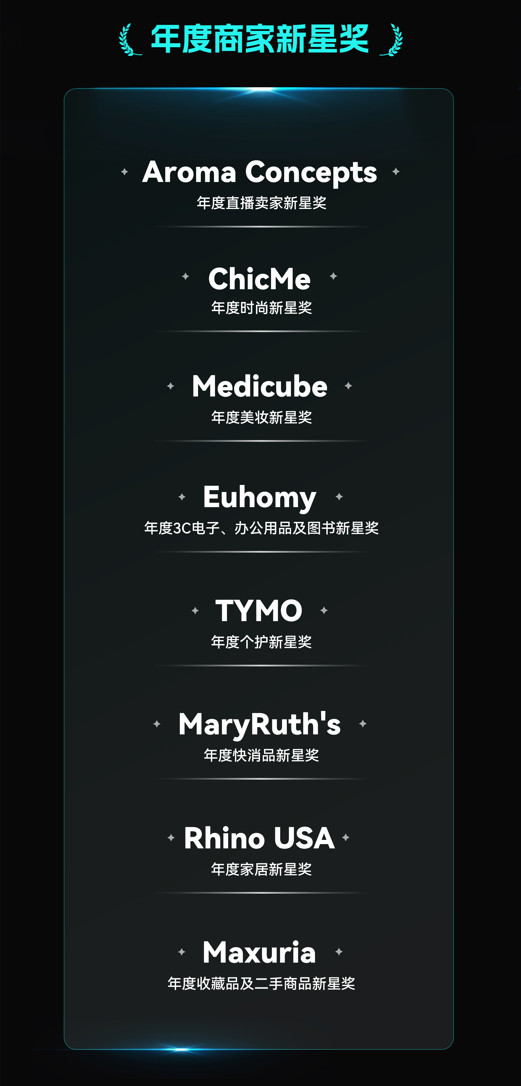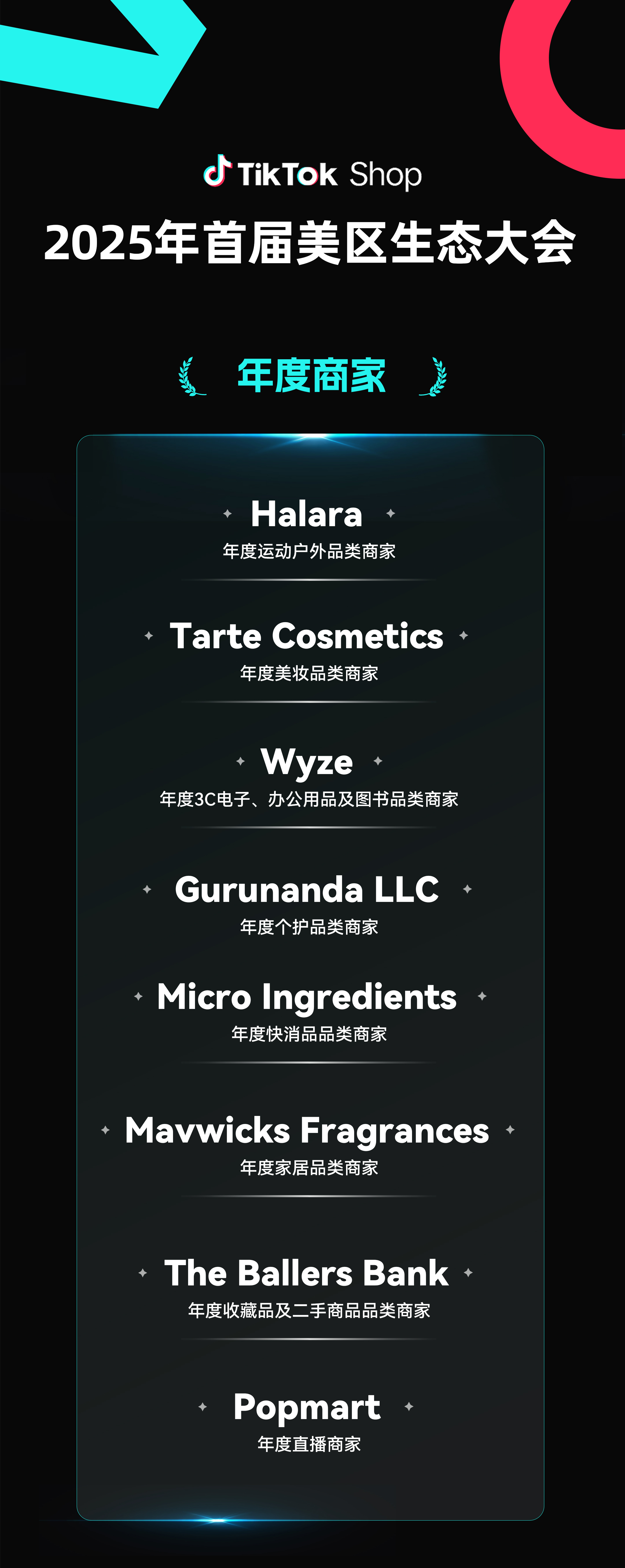 此外,此次生態(tài)大會,表彰了一批優(yōu)秀商家,獎(jiǎng)項(xiàng)涵蓋年度商家,新星商家,營銷大促商家三個(gè)類別。其中Halara、Popmart、ChicMe、Euhomy、TYMO、OQQ、Pacsun、Tarte Cosmetics、Wyze、Crocs等商家獲得了重磅獎(jiǎng)項(xiàng)。