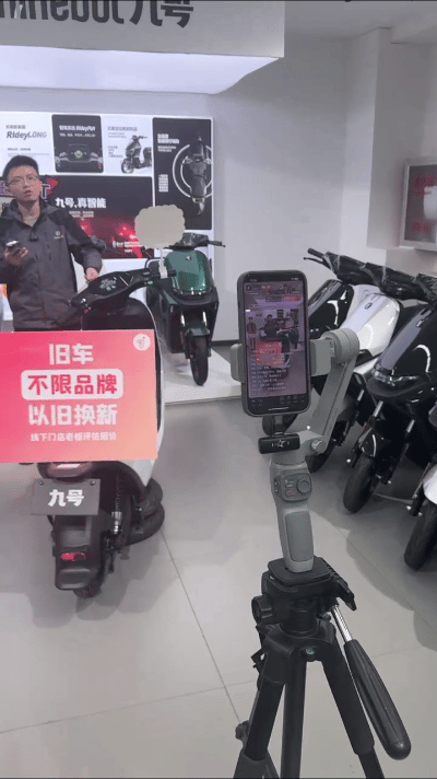 他的直播設(shè)備很簡單,就是一個支架、一個云臺再加一部手機,不過其中的一個小巧思卻頗為亮眼——他為九號電動車配備了一個旋轉(zhuǎn)底座,如此一來,直播畫面中始終有一輛電動車在緩緩旋轉(zhuǎn),牢牢吸引著觀眾的目光。