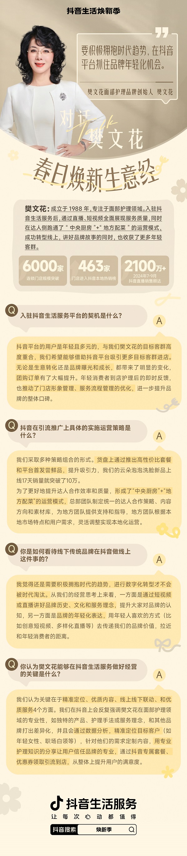 樊文花在抖音寫下的,不僅是通過線上經(jīng)營煥活線下生意的故事,更是 一個成立37年的品牌,如何主動擁抱年輕人群、擁抱運營效率,邁向年輕化和規(guī)?;?/strong>的故事。