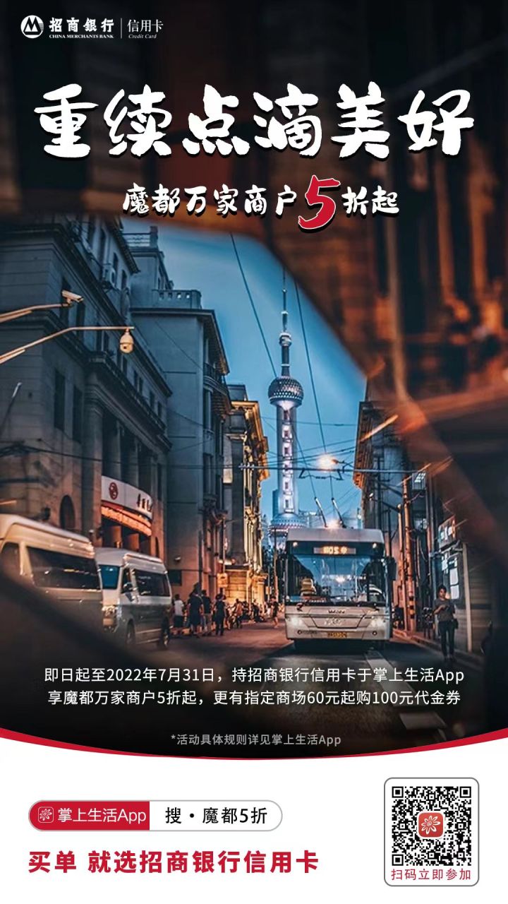 隨著上海全面有序復工復產復市,這座城市的點滴美好生活正在重續(xù):路邊咖啡店、日料店、火鍋店重新開放堂食,各大商圈也逐步人潮涌動,美好的夏日如期而至。政策層面,上海積極支持擴大消費市場規(guī)模,發(fā)布《上海市加快經濟恢復和重振行動方案》,加速釋放消費活力,穩(wěn)定市民消費信心。 作為在滬企業(yè),招商銀行信用卡積極響應上海市委市政府號召,短時間內調動多方資源,打造面向上海地區(qū)持卡人的“魔都萬家商戶5折起”活動。該活動主要覆蓋餐飲及各大商圈,通過一套“組合拳”擴內需、促消費,為各類市場主體紓困解難,助力申城美好生活重續(xù)。
