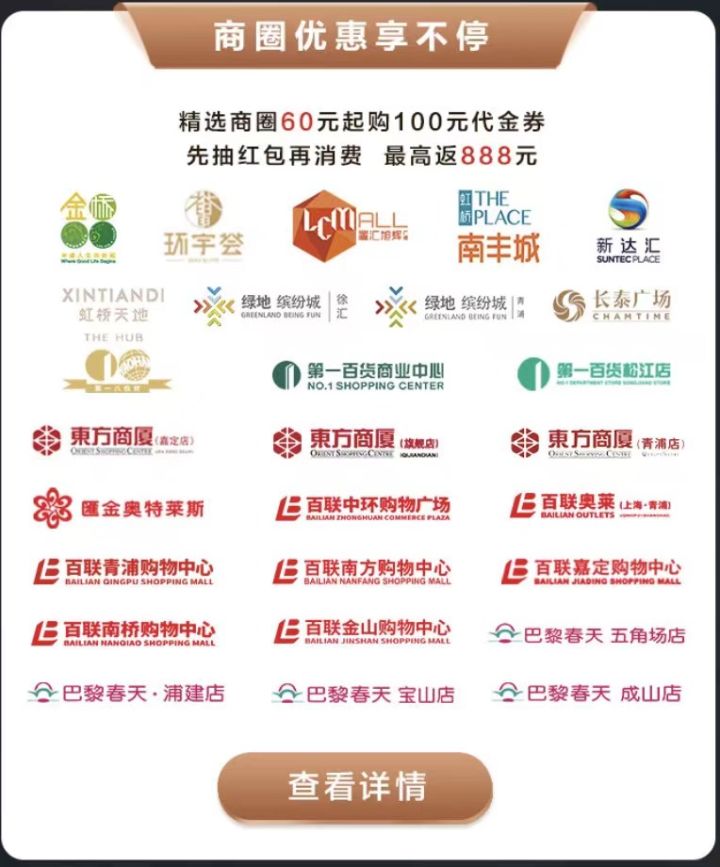 24小時營業(yè)的便利店是一座城市的溫情燈塔,特別是在午夜后,臨街的店鋪大多已經打烊,只有各家便利店,仍燈火通明地在深夜中堅守。上海的便利店是一道獨特的城市“風景線”,根據相關報告,其便利店數量穩(wěn)居全國第一。此次“魔都萬家商戶5折起”活動中,上海超1600家便利店購物5折起,客戶在7-11、羅森、全家等便利店買單時,更可享“一招過”隨機立減活動。 商圈作為城市的地標性綜合體,既是城市發(fā)展的烙印,也是市民“一站式”吃喝玩樂購的重要場所。此次“魔都萬家商戶5折起”活動,招行信用卡客戶可在不同商圈分別參與60元起購100元指定商圈消費券,或抽招財紅包,最高可享888元返現。參與的商圈都是上海極具代表性的,涵蓋金橋國際、虹橋天地、虹橋南豐城、第一八佰伴等近30家人氣商場。