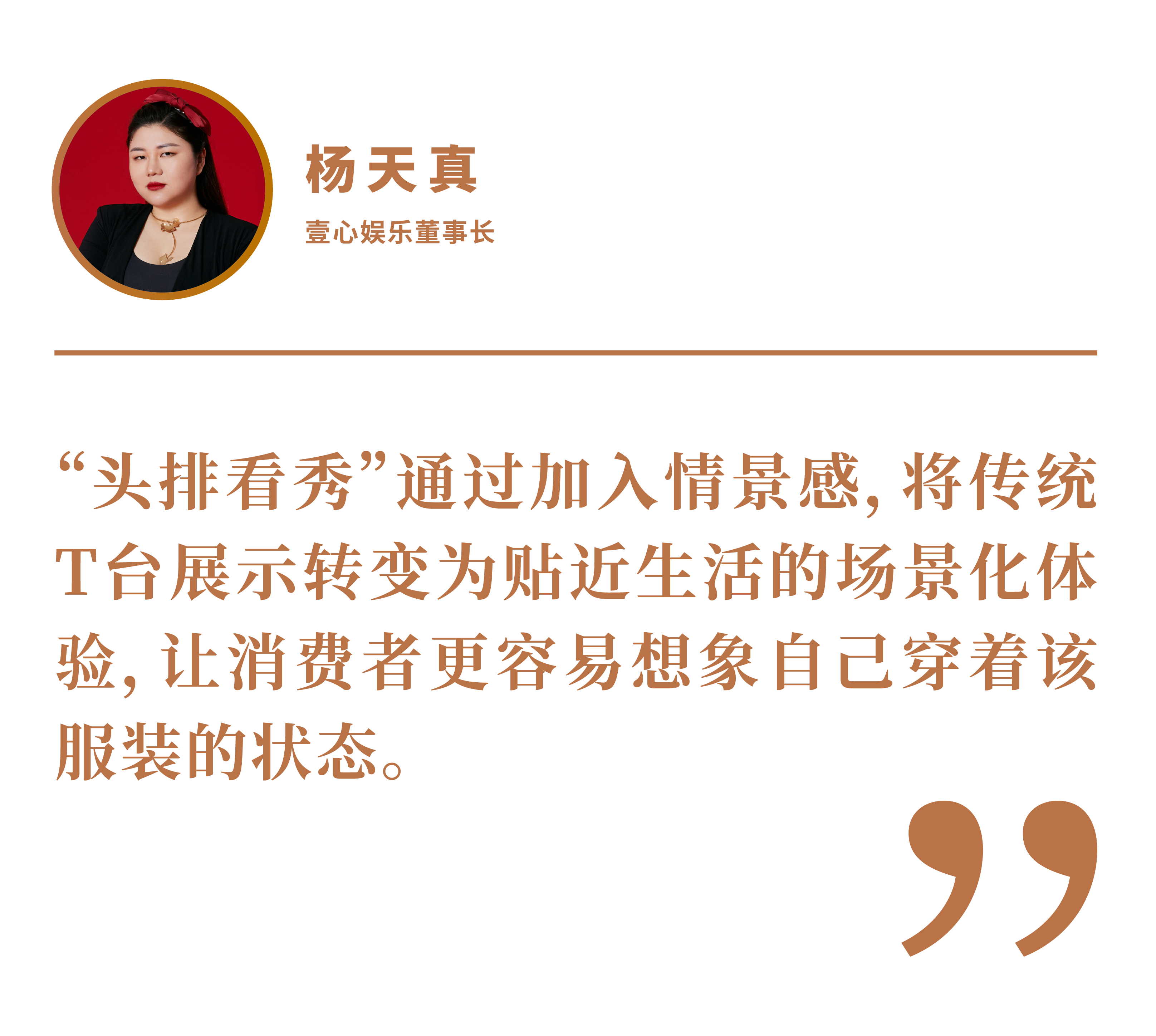 作為本次大秀的明星代表,楊天真認為:“服裝不僅是實用品,更是一種情緒表達工具,其成功依賴于對大眾情緒的理解以及提供匹配的產(chǎn)品。”因此,這種模式不僅提供了情感上的共鳴,還增強了用戶的參與感,促進了即時購買行為的發(fā)生。