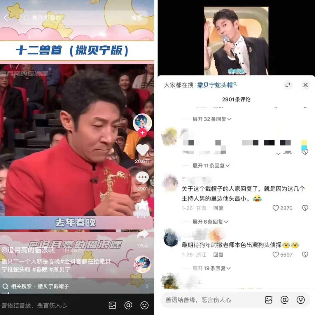 作為「春晚保留節(jié)目」,撒貝寧在春晚帶生肖帽已是觀眾心目中的經(jīng)典橋段,「今年小撒還會帶帽子嗎?」「狠狠期待撒老師的蛇頭帽」在春晚前夕就是用戶熱議的話題。