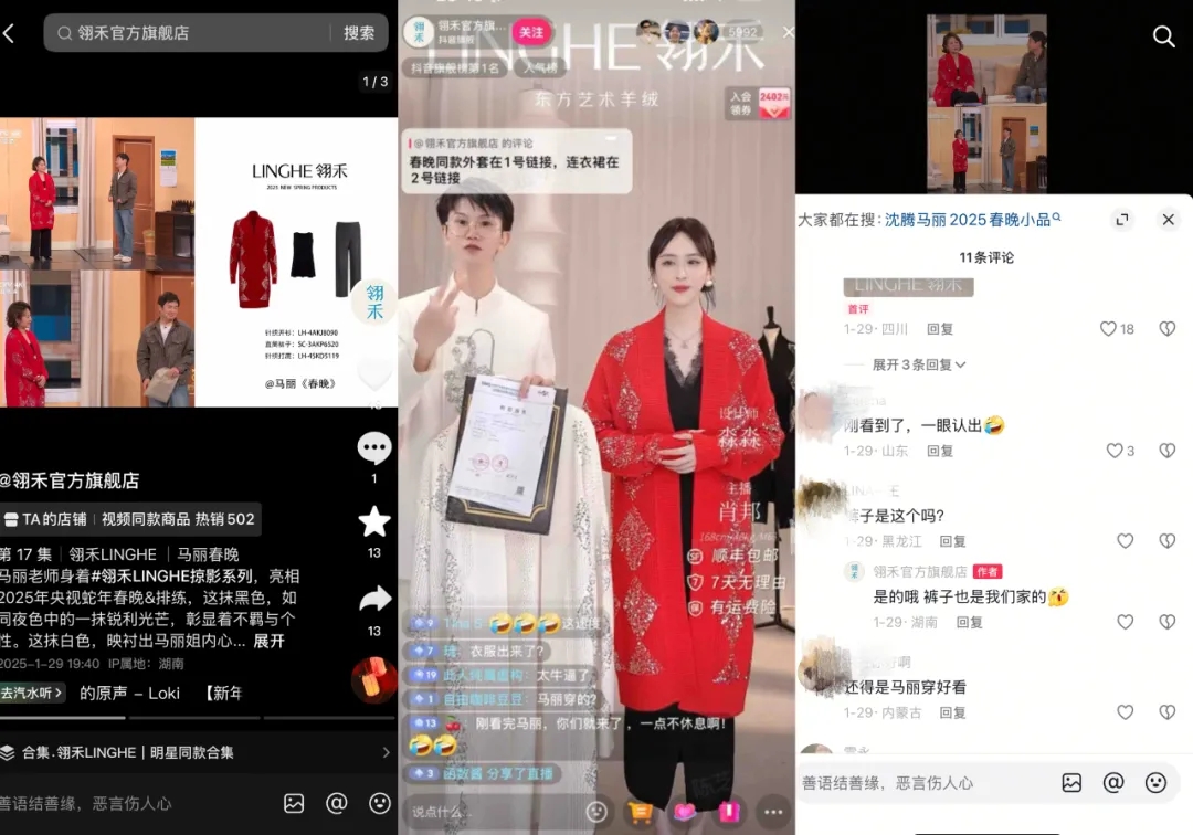 本土新中式服飾品牌翎禾 LINGHE 在去年龍年春晚就憑借「馬麗同款白色大衣」巧妙出圈,今年春晚也不例外。當馬麗穿著翎禾 LINGHE 出現(xiàn)在小品《金龜婿》中時,相關熱點#必須讓我媽擁有馬麗同款開衫 隨即被用戶搜上熱榜,品牌也快速做出反應,認領熱點同款,連夜開啟直播,有不少網(wǎng)友就表示:“速度可以啊,馬麗同款,一眼就看出來了”。