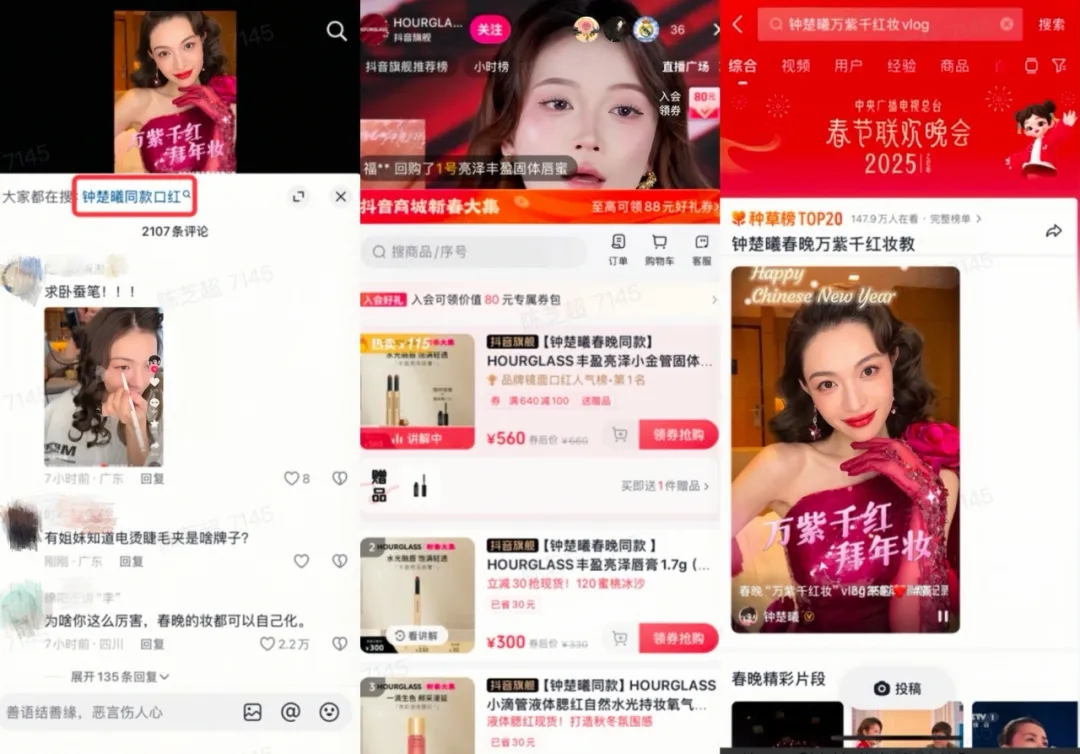 彩妝品牌Hourglass則圍繞其代言人鐘楚曦春晚相關熱點#鐘楚曦春晚萬紫千紅妝教、#鐘楚曦春晚紅裙是自己設計的,一方面官方在相關內(nèi)容評論區(qū)主動認領,激發(fā)用戶搜索,另一方面同步優(yōu)化商品標題,直播間迅速開播做承接,一套組合拳下來,優(yōu)質(zhì)熱點種草內(nèi)容的集中爆發(fā),由此激發(fā)出小藍詞「鐘楚曦同款口紅」,用戶在看到相關熱點視頻時,能直接通過小藍詞進入產(chǎn)品詳情頁。據(jù)了解,熱點上線后3日,Hourglass品牌自播間GMV翻倍增長,「鐘楚曦同款」HOURGLASS小金管單品GMV更是環(huán)比增幅1129%。