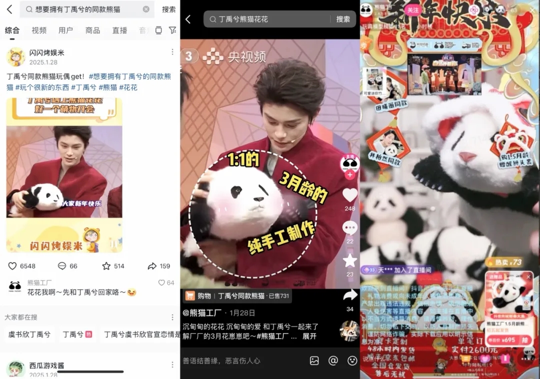 在今年春晚倒計時節(jié)目《春晚等著你》中,被丁禹兮抱著的熊貓玩偶就成了用戶關注的熱點,@熊貓工廠 快速策劃#想要擁有丁禹兮的同款熊貓 話題,內(nèi)容團隊在直播當天集體實時錄屏,積累并發(fā)布了與丁禹兮同款熊貓相關的諸多優(yōu)質(zhì)短視頻內(nèi)容素材,如“小丁的第一支熊貓寶寶”“小丁的同款花花下臺后去了哪里呢?”“小丁一眼就愛上的熊貓是……”。