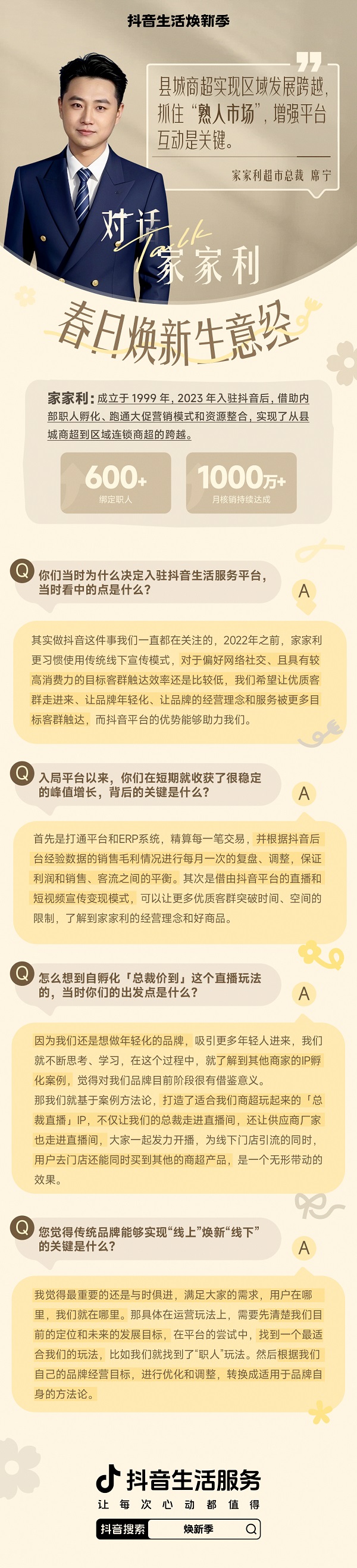 2025年,在平臺(tái)的線上經(jīng)營中進(jìn)入穩(wěn)定發(fā)展期的家家利,有了更長遠(yuǎn)的發(fā)展目標(biāo):利用抖音平臺(tái)聚攏年輕、優(yōu)質(zhì)客群的優(yōu)勢,重塑家家利品牌,以總裁價(jià)到、廠家聯(lián)動(dòng)和IP人設(shè)的方式,讓更多年輕、優(yōu)質(zhì)客群有直面超市管理團(tuán)隊(duì)提建議的渠道,為實(shí)體門店賦能帶動(dòng)更多客流。