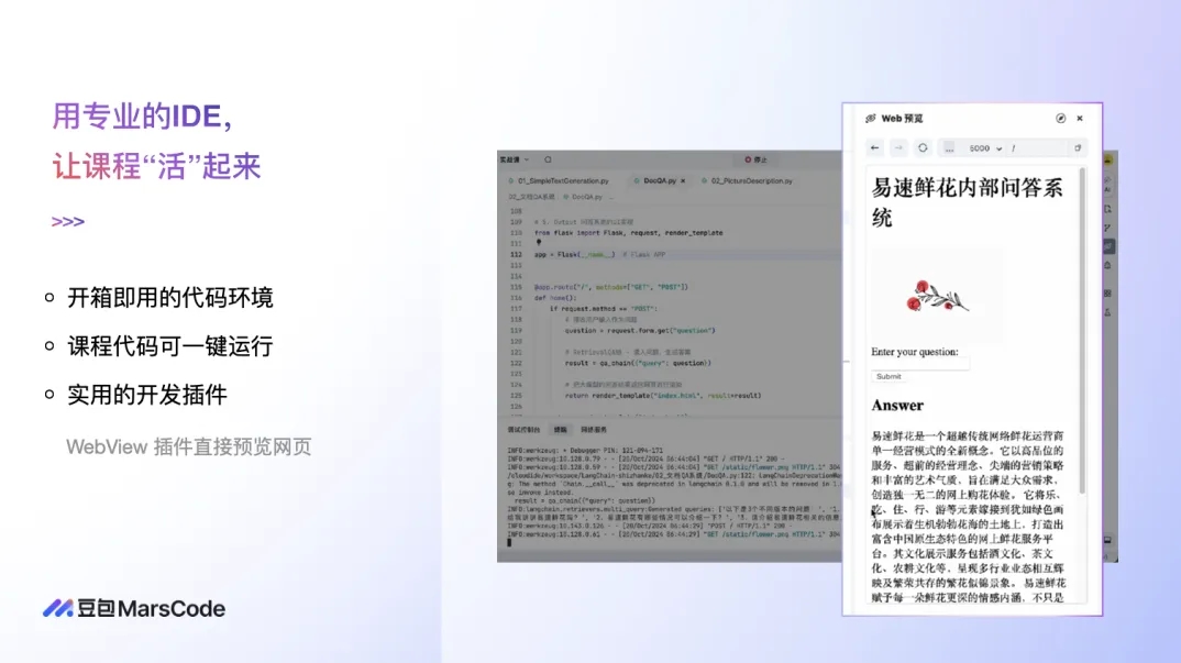 針對(duì)學(xué)習(xí)新語(yǔ)言或框架時(shí)面臨的繁瑣環(huán)境搭建與低效學(xué)習(xí)問(wèn)題,豆包MarsCode 推出了 AI 練中學(xué)產(chǎn)品。該產(chǎn)品通過(guò)專業(yè)的 IDE 激活課程,為開(kāi)發(fā)者提供開(kāi)箱即用的代碼環(huán)境,極大縮短學(xué)習(xí)準(zhǔn)備時(shí)間。同時(shí),AI 助教的無(wú)縫嵌入,讓開(kāi)發(fā)者在學(xué)習(xí)過(guò)程中遇到問(wèn)題時(shí)能夠即時(shí)獲得解答,無(wú)需跳出課程進(jìn)行搜索比對(duì)。