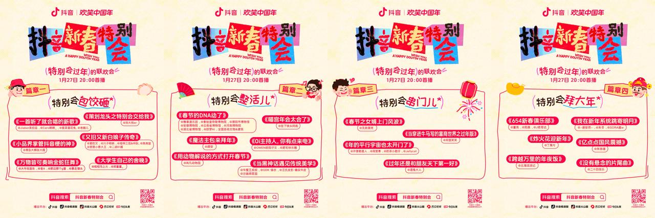 四大篇章層層遞進(jìn)的排布,“特別會(huì)包餃砸”是用具有抖音感的方式解構(gòu)致敬傳統(tǒng)聯(lián)歡會(huì),奠定歡樂有年味的節(jié)目基調(diào);“特別會(huì)整活兒”是對(duì)平臺(tái)熱點(diǎn)的回應(yīng),也是抖音創(chuàng)作者們的創(chuàng)作才華的全力展示,“特別會(huì)串門兒”展現(xiàn)的是抖音里過年的多種可能,是想象力上最飛揚(yáng)不拘的一章。而“特別會(huì)拜大年”則是整臺(tái)節(jié)目的情感高潮,賦予了用戶“被看到”的情緒價(jià)值,也為這臺(tái)歡樂有梗的節(jié)目增加了一抹溫情色彩。