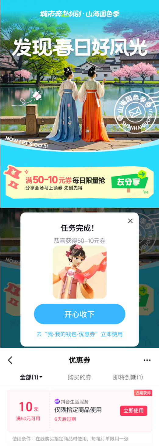 此次活動更開創(chuàng)政企合作新范式,多地文旅部門深度參與內(nèi)容共創(chuàng),深度融合城市人文特質(zhì)與自然景觀,共同打造主題特色鮮明、獎勵豐富精彩的沉浸式文旅活動?;顒訌纳橡垺腹哺耙粓龃喝栈ㄊ隆怪黝}盛典和武漢「漢馬美食生活節(jié)」開始,一站打卡限定好禮和獨家體驗,快來跟抖音一起漫步春日好風(fēng)光吧!