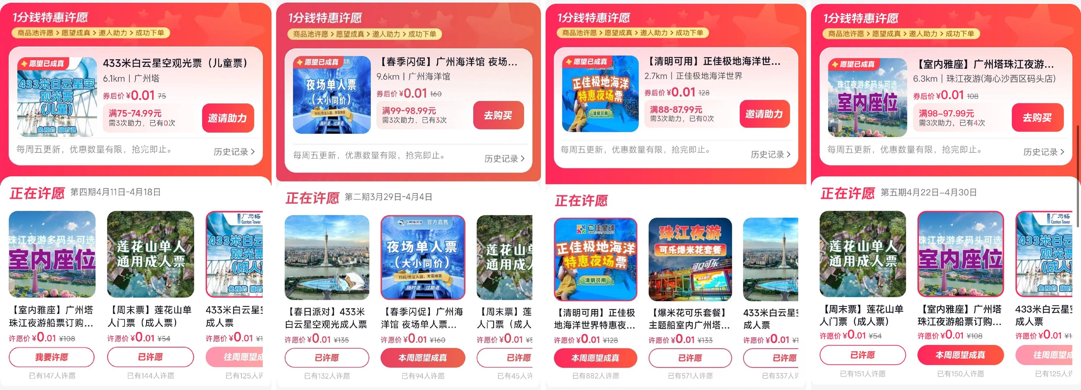 線下大事件之外,線上傳播以福利玩法、達(dá)人種草與社群滲透,推動(dòng)活動(dòng)熱度持續(xù)攀升。預(yù)熱期間,「去哪玩」頻道圍繞春日氛圍推出“1分錢(qián)許愿旅行”活動(dòng)。用戶(hù)只需邀請(qǐng)好友助力,即可有機(jī)會(huì)以0.01元的價(jià)格獲得心儀景區(qū)的福利套餐。抖音用戶(hù)積極參與許愿,活動(dòng)首期促成 5250 萬(wàn)元交易額,形成 “社交裂變 - 流量轉(zhuǎn)化 - 口碑傳播” 的正向循環(huán)。
