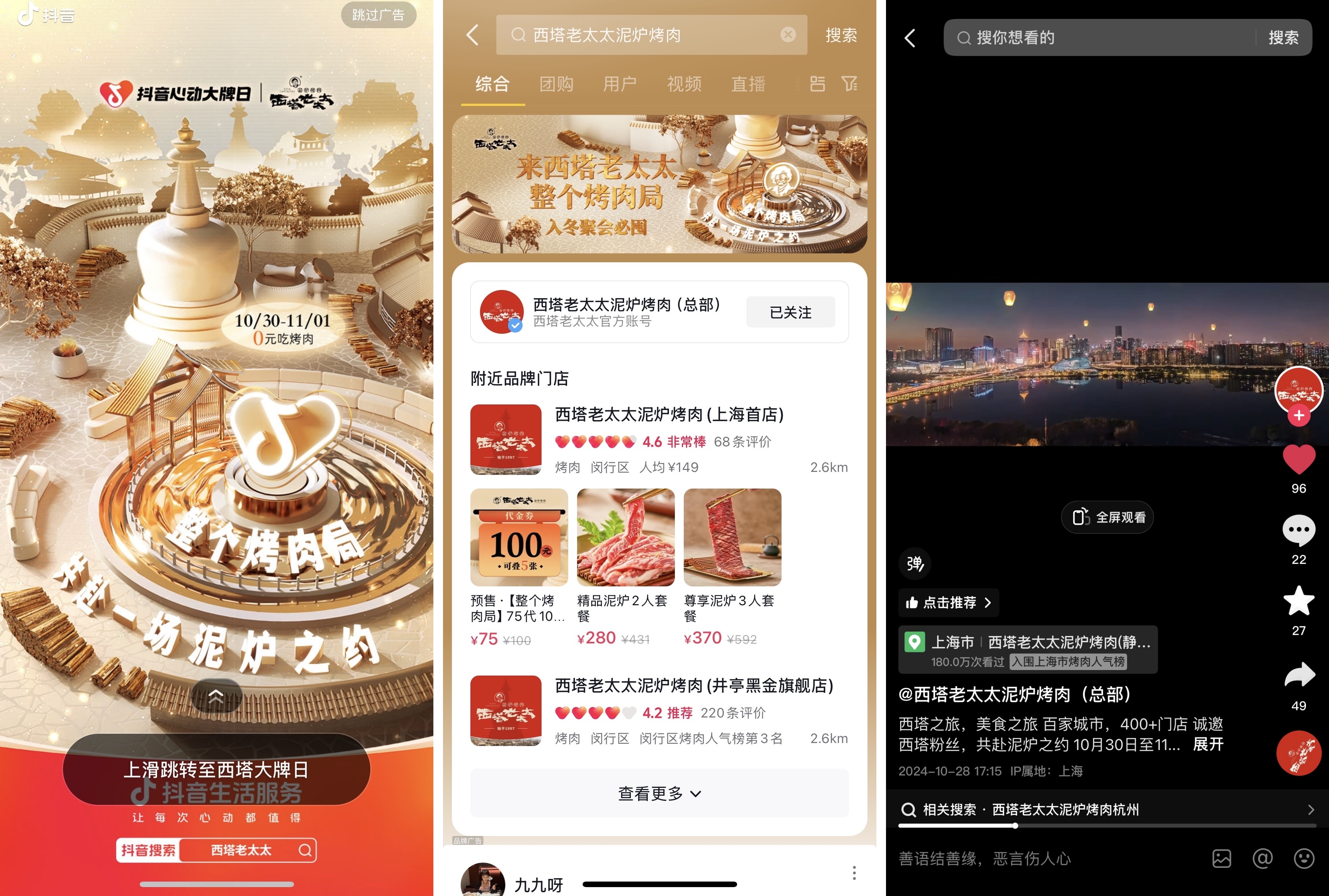 從燒烤攤起家的烤肉連鎖品牌西塔老太太,首次攜手「抖音心動大牌日」展開合作,于10月22日至11月4日,共同啟動了一場“整個烤肉局(全國場)”秋冬福利回饋活動,依托超低折扣代金券的推出、特色烤肉文化理念的輸出、直播間多元創(chuàng)意玩法的落實,實現(xiàn)了線上線下一體式整合營銷,有效提升了門店客流量與人氣,為品牌帶來了廣泛曝光與交易轉(zhuǎn)化,達到增粉固粉的雙重效果。