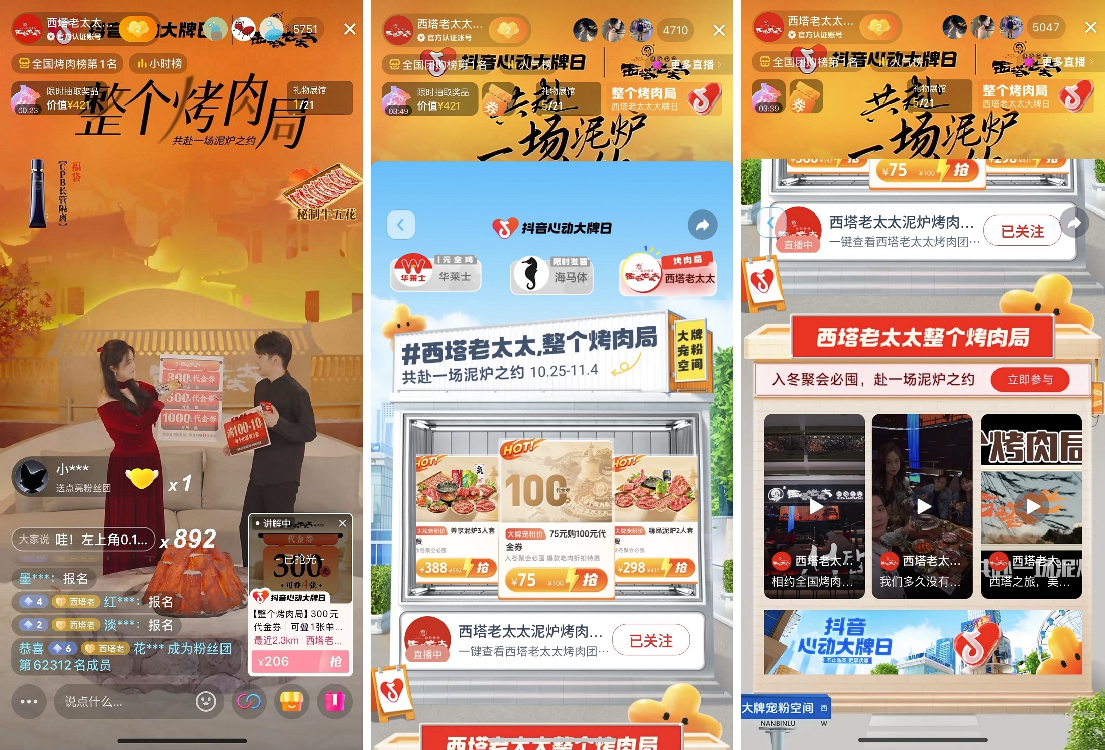 在本次秋冬專場營銷的關(guān)鍵節(jié)點,西塔老太太首次聯(lián)動全國門店,與「抖音心動大牌日」強強聯(lián)合,共同發(fā)力。通過優(yōu)質(zhì)烤肉品類的供給,以及抖音直播間創(chuàng)意場景搭建和互動玩法,全方位拉升了品牌勢能。在吸粉固粉的同時,也實現(xiàn)了從流量到交易的順暢轉(zhuǎn)化。