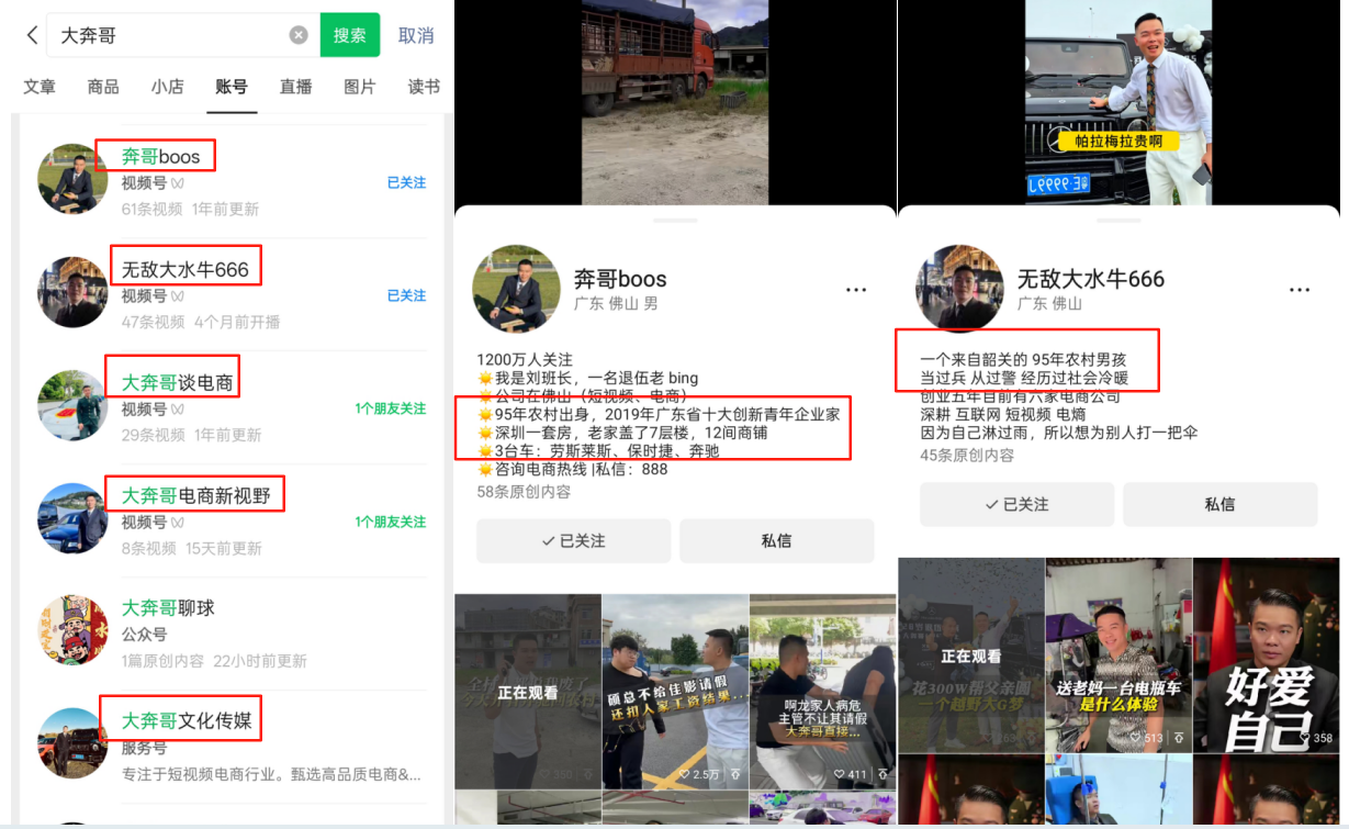 有消費者反映,他們都是通過短視頻平臺刷視頻時刷到了“大奔哥”“劉總”“鵬總”“鵬哥”“鵬班長”。媒體在微信視頻號中搜索上述關鍵詞,竟然出現(xiàn)數(shù)十個賬號,視頻中均出現(xiàn)一個經(jīng)常身著軍裝的男子出鏡,擺拍各種場景的視頻,一副好心人、成功人士的裝扮。