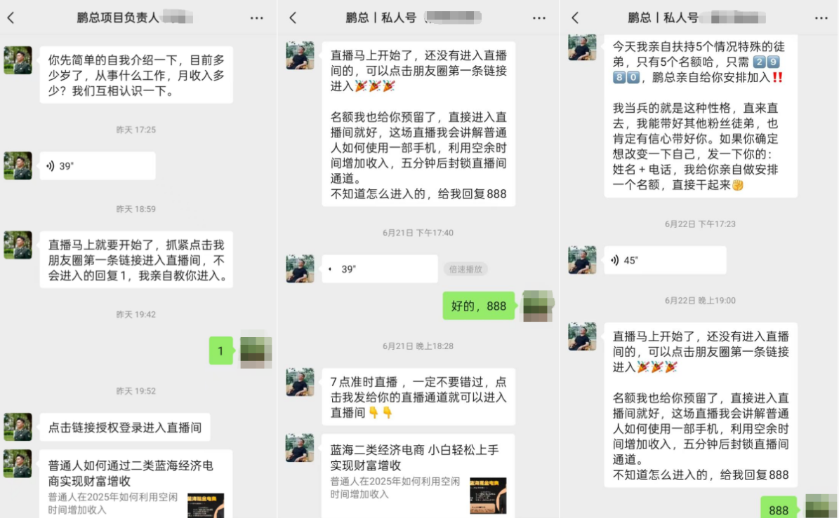 2025年3月份以來,媒體通過上述短視頻賬號分別添加了“大奔哥”“劉總”“鵬總”“大犇哥”等多個微信,每次添加完成后,對方就立即詢問年齡、職業(yè)、收入等情況,精準掌握添加者信息。并且不定時給媒體發(fā)來直播預告,按其要求發(fā)送數(shù)字就能獲取直播鏈接。