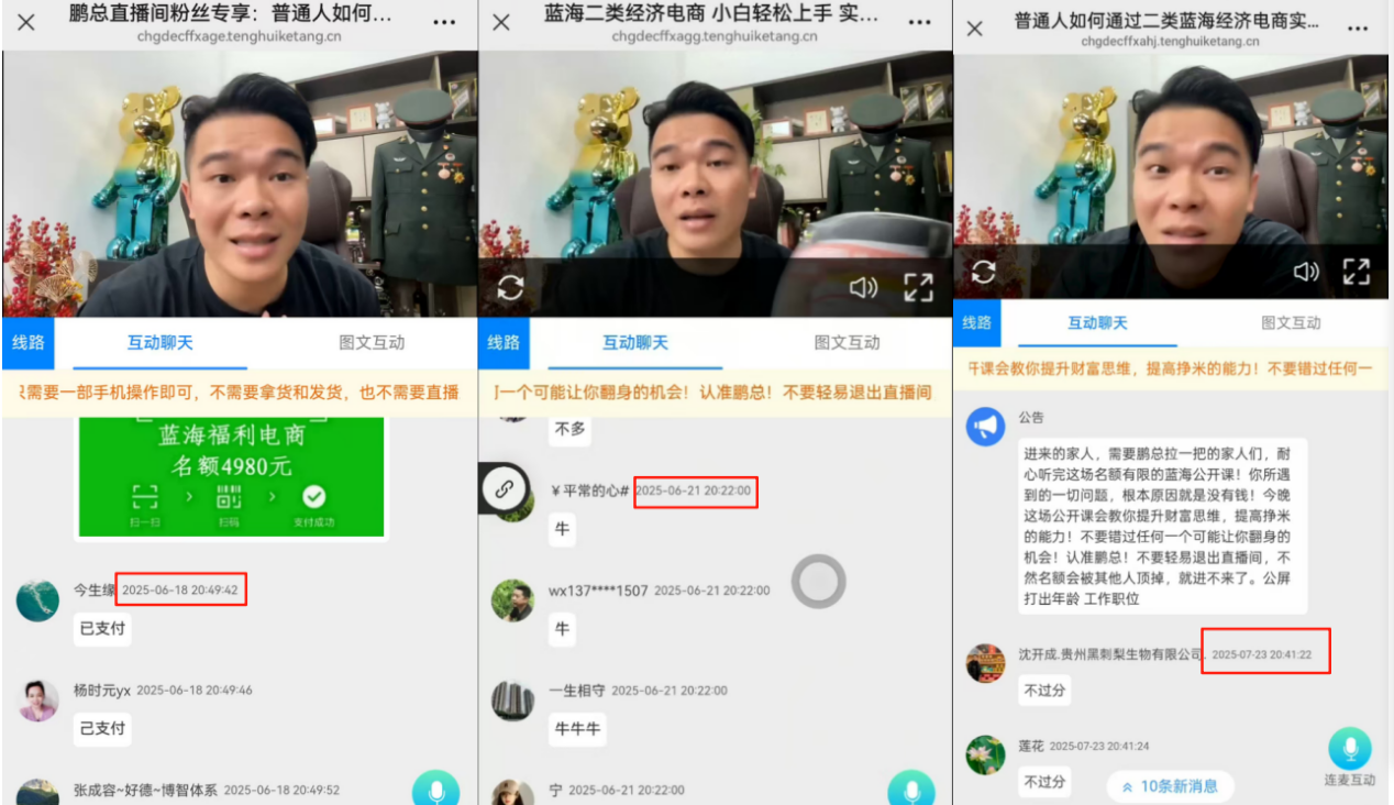 介紹完掙錢的項目和方法,當晚8時45分以后“大奔哥”開始在直播間叫賣“我們的內(nèi)部定價是8980元,今天付款只需要4980元”“1分信任,我還你12分責任”“今天只開放10個名額,下完播就恢復原價8980元”“名額已經(jīng)不多了”。直播間里不斷傳來“企業(yè)微信收款4980元”的收款提示音,故意營造緊張氣氛。直播間的評論區(qū)不間斷彈出“給我一個名額”“在哪報名”“4980元太值了”等評論,制造火爆場面,對信任的網(wǎng)友實施精準收割。