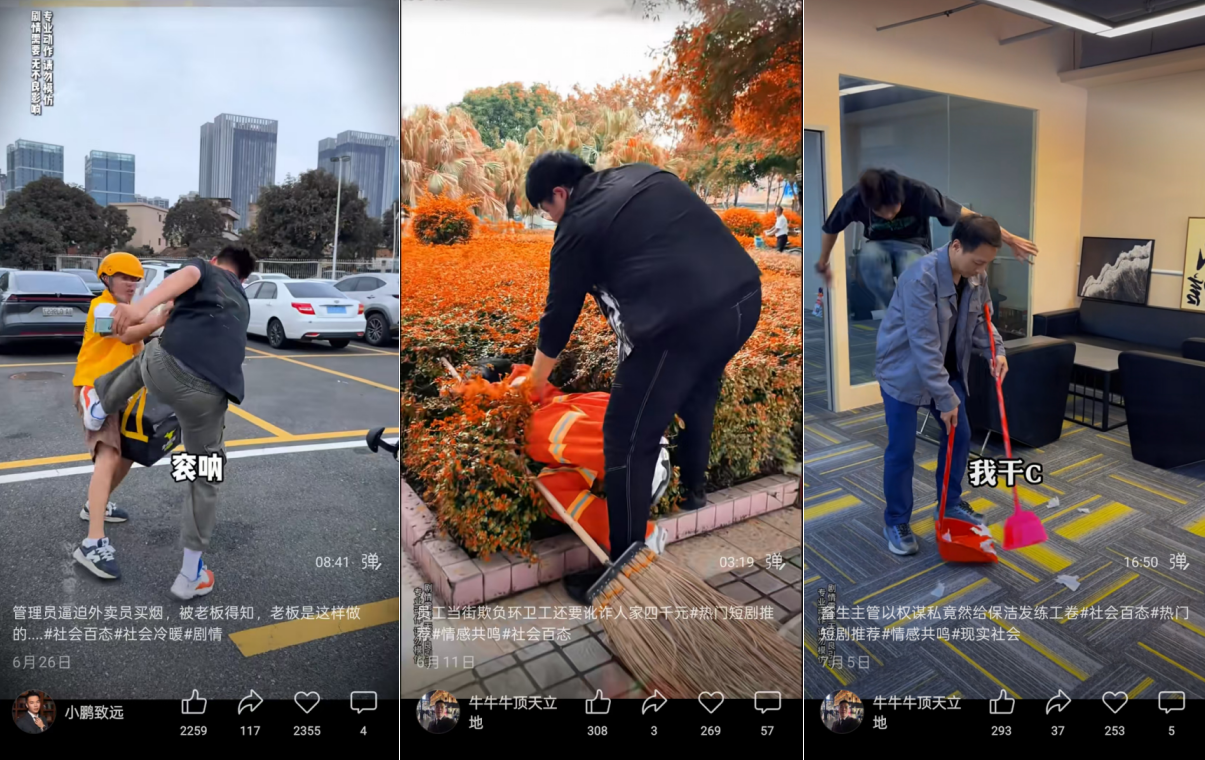 媒體查看多個賬號高頻次發(fā)布的視頻發(fā)現(xiàn),內(nèi)容主要有三大類別。首先是一些“農(nóng)村女孩應聘遭員工索要好處被大奔哥發(fā)現(xiàn)開除”“囂張員工往同事泡面吐口水被大奔哥發(fā)現(xiàn)泡面潑臉”“主管給保潔員發(fā)練功券私吞血汗錢被大奔哥發(fā)現(xiàn)后用錢打臉”等視頻。這些視頻中,大多涉及新就業(yè)群體,多次出現(xiàn)擺拍毆打、侮辱應聘者、保潔、環(huán)衛(wèi)工、外賣騎手等。這些視頻大多以夸張標題文案,渲染炒作不實內(nèi)容博取流量。另外,這些帳號發(fā)布作品IP顯示或者微信號地區(qū)顯示為廣東省、佛山市。