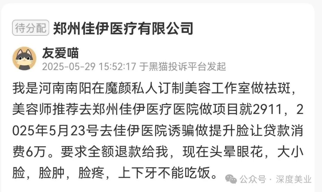 據(jù)消費者描述,5月23日,該消費者前往鄭州佳伊醫(yī)療醫(yī)院,被誘導進行臉部提升項目并以貸款形式消費六萬元,現(xiàn)該消費者要求該機構(gòu)全額退款,稱出現(xiàn)頭暈眼花、大小臉、臉腫、臉疼、上下牙無法正常咀嚼進食等癥狀。