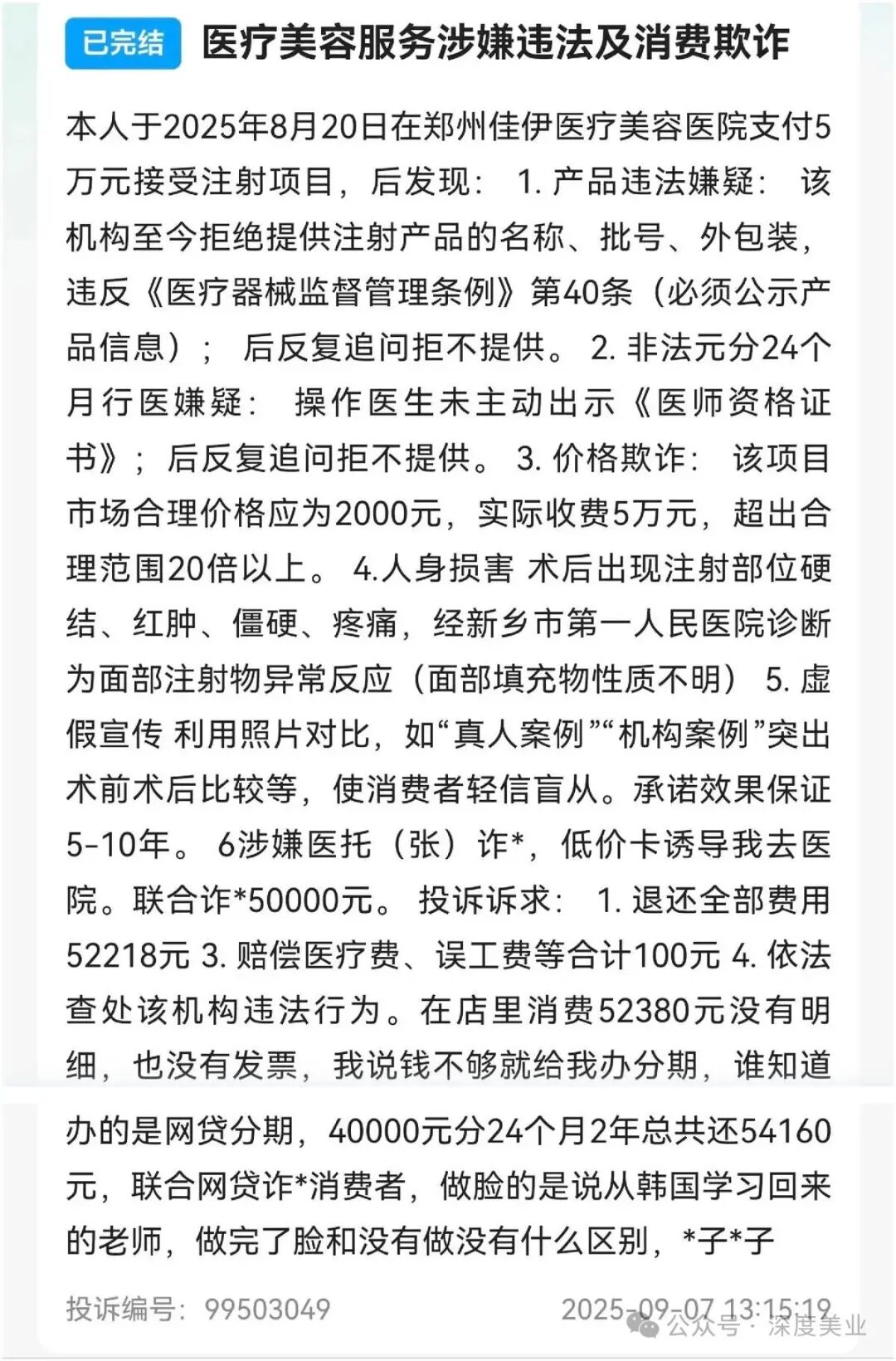 該消費者投訴訴求包括退還全部費用52218元,賠償醫(yī)療費、誤工費等,依法查處該機構(gòu)違法行為。該消費者表示其在該機構(gòu)消費52380元沒有明細,沒有發(fā)票。該消費者錢不夠支付時,工作人員為其辦理了分期,但該消費者并不知道辦的是網(wǎng)貸分期,40000元分期24個月總共還54160元。她認為該機構(gòu)存在聯(lián)合網(wǎng)貸詐騙消費者的情況。截至深度美業(yè)發(fā)稿前,該投訴因未能及時聯(lián)系到該機構(gòu)而被平臺自動關閉。