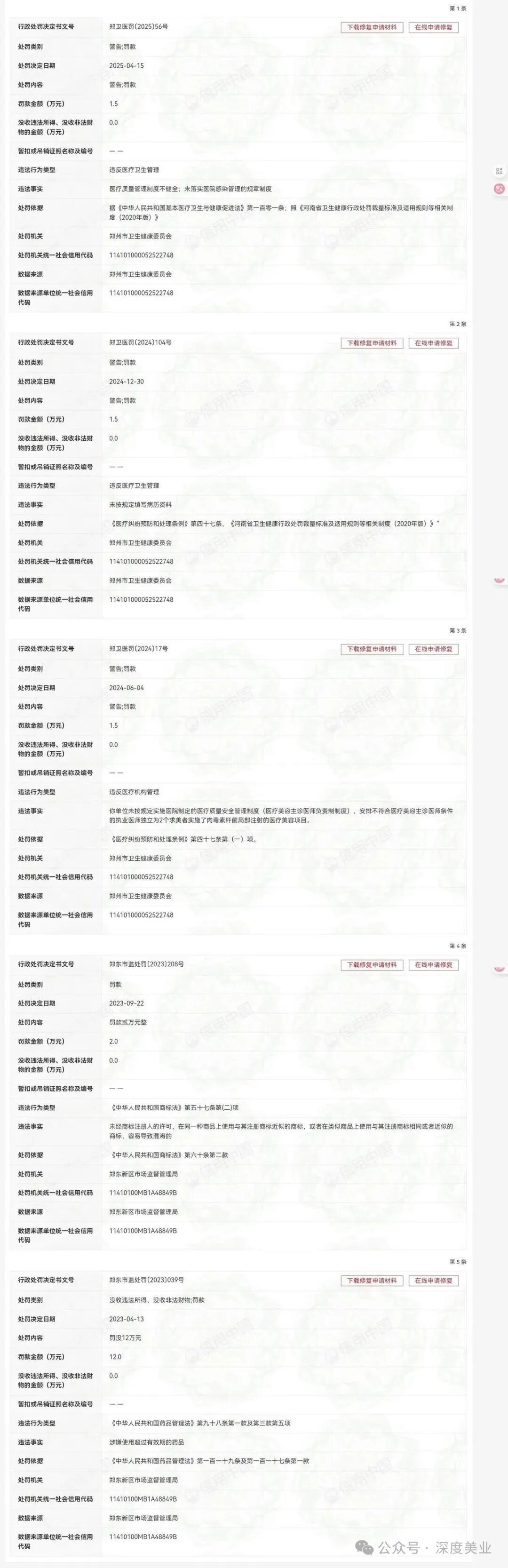 信用中國顯示,鄭州佳伊自2023年起到今年4月,累計受到相關監(jiān)管部門五次行政處罰。今年4月,還因違反醫(yī)療衛(wèi)生管理相關規(guī)定,存在醫(yī)療質(zhì)量安全管理制度不健全等原因被罰1.5萬元。其余處罰包括未落實醫(yī)院感染管理的規(guī)章制度、 未按照規(guī)定填寫病歷資料 、 未按規(guī)定實施醫(yī)療質(zhì)量安全管理制度,安排不符合美容主診醫(yī)師條件的執(zhí)業(yè)醫(yī)師獨立為2名患者實施了肉毒素注射面部注射醫(yī)療美容項目。未經(jīng)商標注冊人的許可,在同一種商品上使用與其注冊商標近似的商標,或者在類似商品上使用與其注冊商標相同或者近似的商標,容易導致混淆的行為。涉嫌使用超過有效期的藥品??傆嬃P款金額高達18.5萬元。