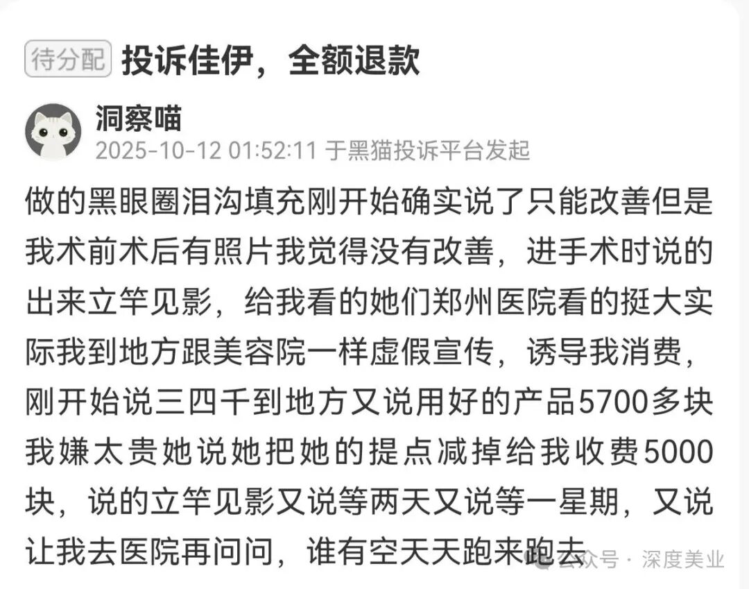 10月12日,一位消費者于黑貓投訴平臺發(fā)起投訴,稱該消費者做了黑眼圈淚溝填充項目,起初該機構(gòu)確實表示只能改善,該消費者留存了術前術后照片,認為術后結(jié)果未實現(xiàn)改善效果。該消費者表示,進入手術環(huán)節(jié)時,該機構(gòu)稱術后效果立竿見影,還向該消費者展示機構(gòu)的相關照片。該消費者提到,照片里看起來規(guī)模較大,實際該消費者到店后發(fā)現(xiàn)此處與美容院無異,存在虛假宣傳、誘導該消費者消費的情況。
