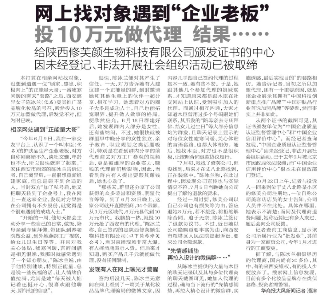 華商報10月23日03版報道西安離異女子陳冰蘭(化名)受相親網(wǎng)站一男子推廣某品牌化妝品的號召,毅然投入10萬元加盟做代理,后發(fā)覺不對,但為時已晚。之后,四川、江西、廣東、河南、浙江等地多名女代理商紛紛致電華商報新聞熱線029-88880000,投訴西安本地多家商貿(mào)、化妝品銷售及生物科技公司,利用網(wǎng)上多名擁有“陽光”人設、被包裝為“成功人士”的男子的情感攻勢,實施化妝品代理招商“圍獵”,進行“精準收割”,其所涉品牌有十幾個,不僅令她們在情感上遭遇打擊,更在經(jīng)濟上造成巨大損失。