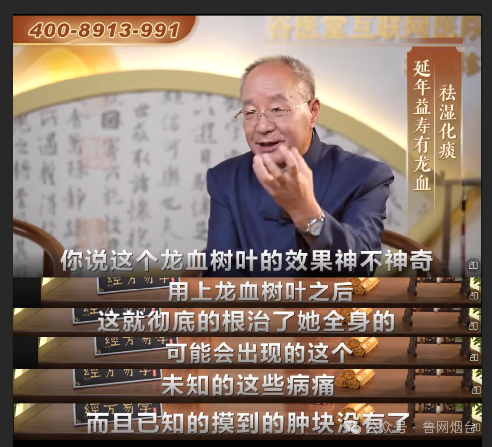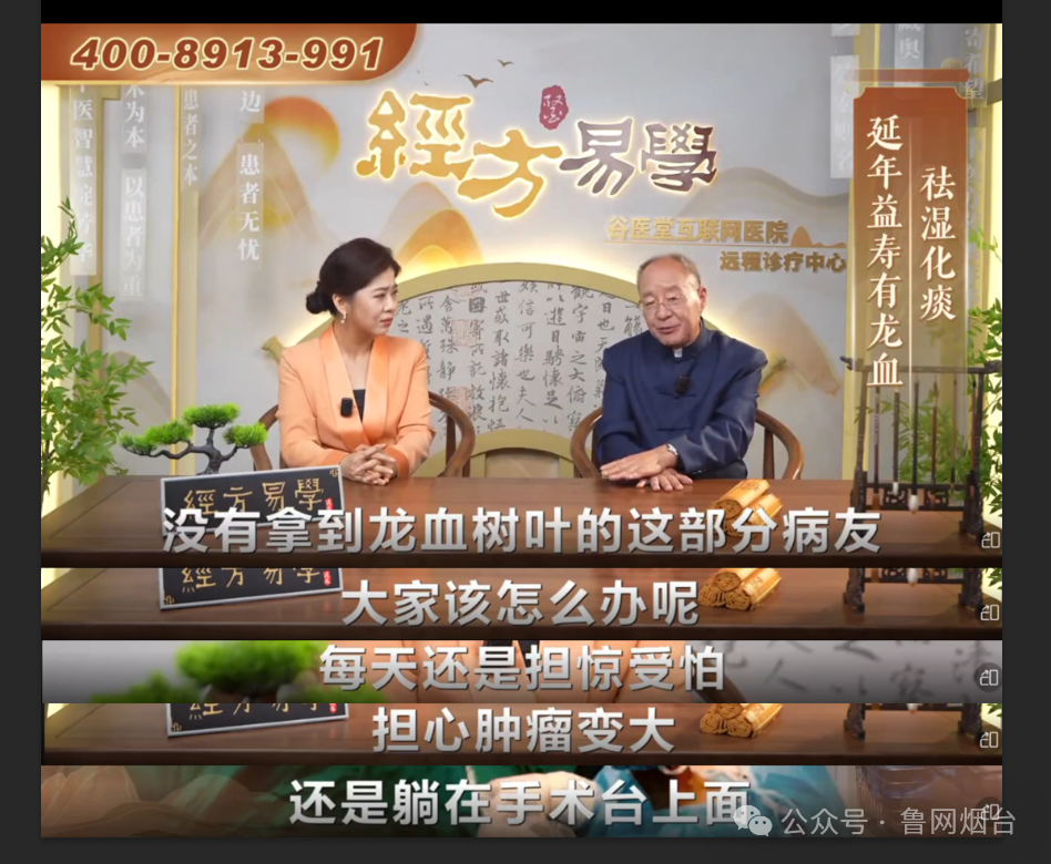 黃女士的母親出于對易法銀教授權(quán)威身份的信任,購買了價(jià)值不菲的“龍血樹葉破壁飲片”。使用兩個(gè)周期后,她的身體疾病癥狀并未得到緩解。今年1月份,黃女士的母親再次被拉入另一個(gè)微信群,群內(nèi)還在播放《經(jīng)方易學(xué)》的視頻,這次除了主持人的衣服顏色有變化,其他內(nèi)容幾乎完全一樣,依然在推銷“龍血樹葉破壁飲片”。回想起去年易法銀教授節(jié)目中講述的“龍血樹葉”極為稀缺,是“生平最后一次服用千年龍血樹葉的機(jī)會了”,黃女士的母親意識到自己可能踩進(jìn)銷售陷阱。