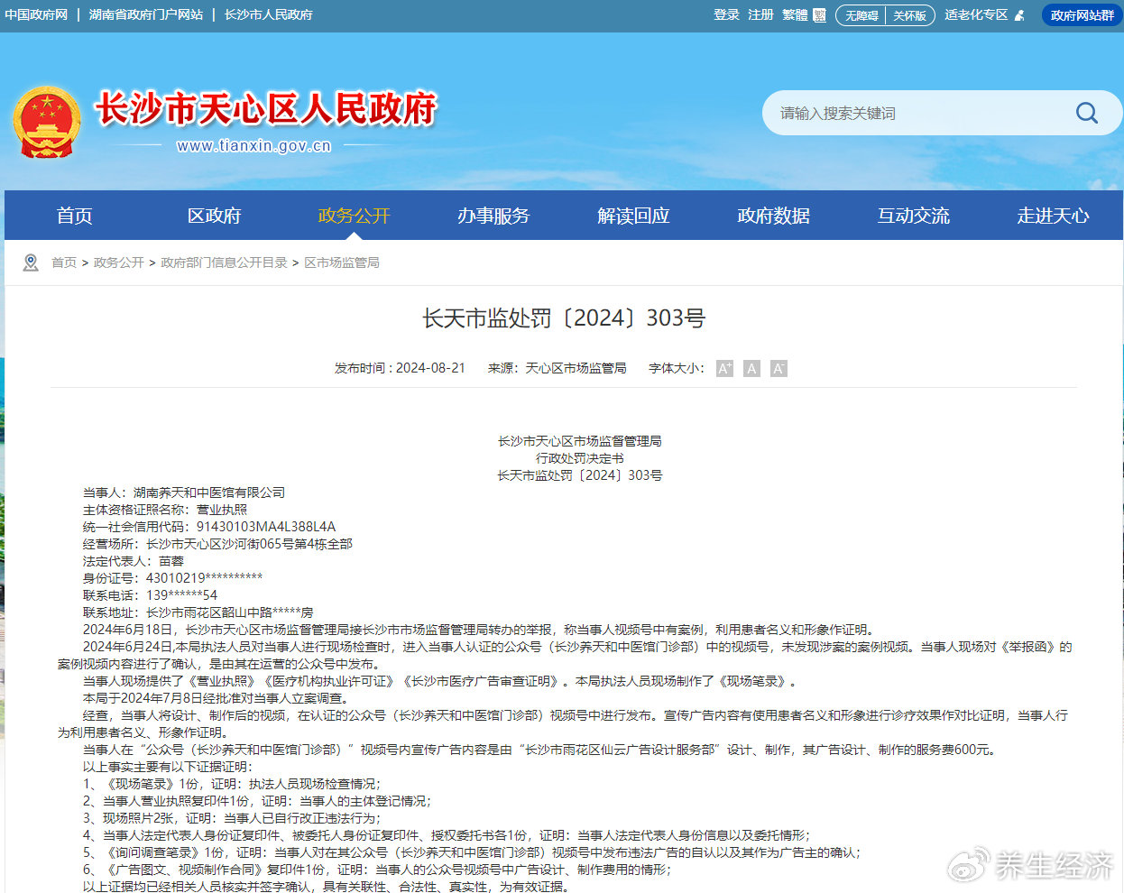 日前,長(zhǎng)沙市天心區(qū)市場(chǎng)監(jiān)督管理局對(duì)湖南養(yǎng)天和中醫(yī)館有限公司(以下簡(jiǎn)稱“養(yǎng)天和”)的違法廣告行為進(jìn)行了處罰。根據(jù)長(zhǎng)沙市天心區(qū)市場(chǎng)監(jiān)督管理局發(fā)布的行政處罰決定書(長(zhǎng)天市監(jiān)處罰〔2024〕303號(hào)),養(yǎng)天和因在公眾號(hào)視頻號(hào)中發(fā)布違法廣告,利用患者名義和形象作證明,違反了《中華人民共和國(guó)廣告法》第十六條第一款第四項(xiàng)的規(guī)定。盡管養(yǎng)天和的行為被認(rèn)定為違法,但處罰結(jié)果僅為罰款900元,這一處罰力度引發(fā)了公眾對(duì)于違法成本過(guò)低的擔(dān)憂。