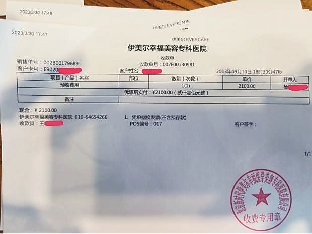 王女士在“伊美爾幸福”進(jìn)行醫(yī)美消費(fèi)長(zhǎng)達(dá)10年之久,因兩次手術(shù)遇到的問題,讓她對(duì)以往做過的醫(yī)美項(xiàng)目、醫(yī)療服務(wù)以及使用的器械、藥品、產(chǎn)品是否合規(guī)合法產(chǎn)生疑問。于是,王女士提出打印既往消費(fèi)項(xiàng)目及產(chǎn)品明細(xì)。令她沒想到的是,在“伊美爾幸福”提供的收款單上,很多項(xiàng)目及產(chǎn)品名稱均顯示為“預(yù)收費(fèi)用”,而不是具體的項(xiàng)目名稱或產(chǎn)品明細(xì)。記者在王女士提供的一份收款單上看到,項(xiàng)目名稱一欄明確標(biāo)明了用于面頰填充的透明質(zhì)酸鈉填充產(chǎn)品“喬雅登豐顏”,數(shù)量顯示為3,實(shí)付金額31265元。但在另一份收款單上,項(xiàng)目名稱一欄僅顯示“預(yù)收費(fèi)用”,數(shù)量顯示為1,實(shí)付金額2100元。