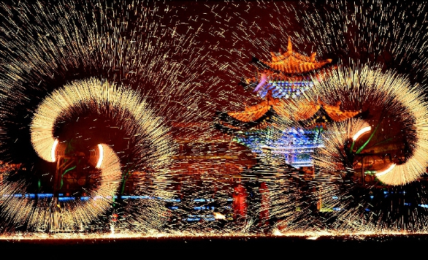 1月13日晚,在山東省棗莊市臺兒莊古城,民間表演隊為游客表演“火龍鋼花”。春節(jié)臨近,山東省棗莊市臺兒莊古城“年味”大戲持續(xù)上演,“火龍鋼花”、百獅賀歲、社火巡游等非物質文化遺產(chǎn)表演輪番上演,精彩紛呈,為市民和游客獻上精彩的“文化大餐”。 cnsphoto 供圖